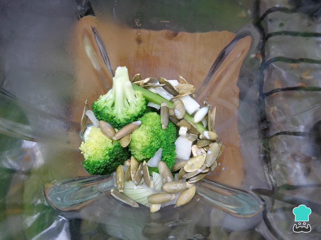 Una vez listos, escurrimos y los colocamos en la licuadora junto con las pipas de calabaza, la cebolla, el ajo y la leche de almendra. Procedemos a licuar todos los ingredientes hasta que obtengamos una salsa homogénea.
