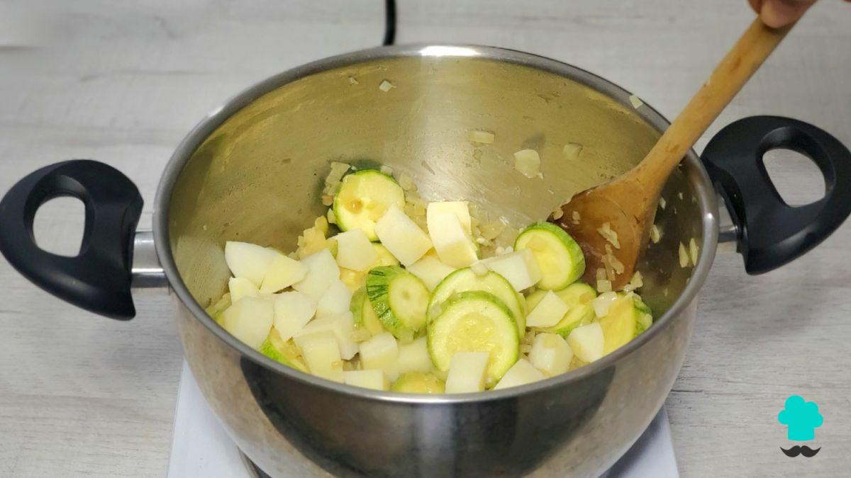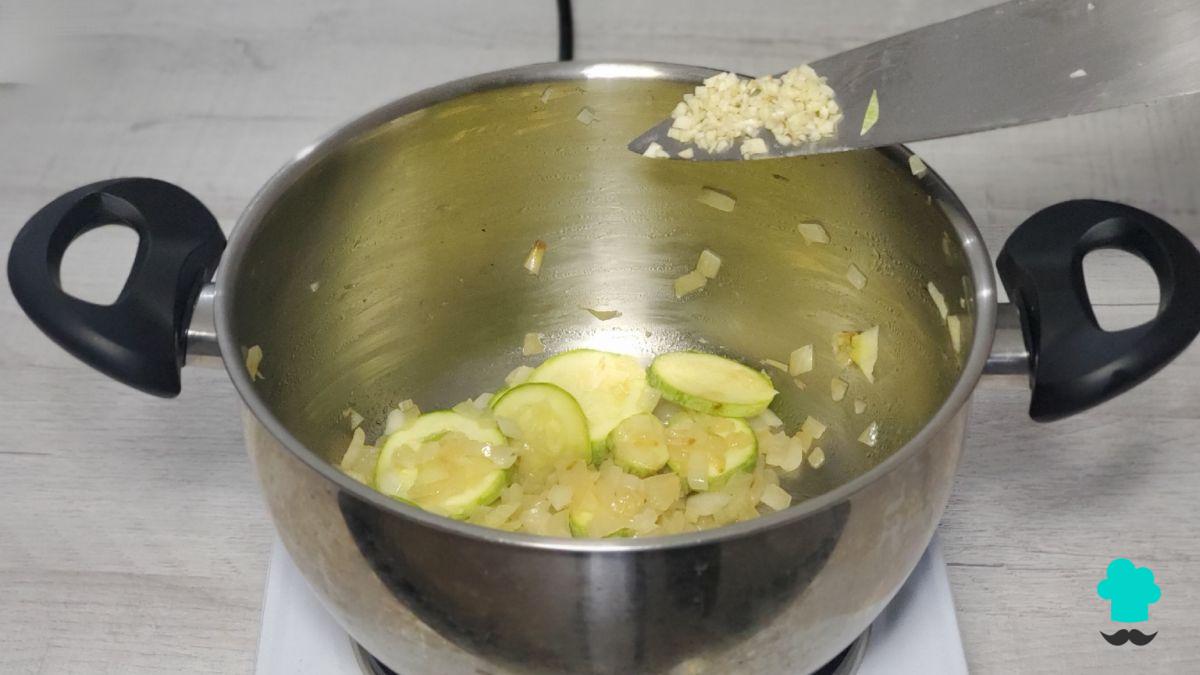 Cocina hasta que la cebolla esté suave y translúcida, luego incorpora el calabacín y remueve unos minutos hasta que empiece a ablandarse.