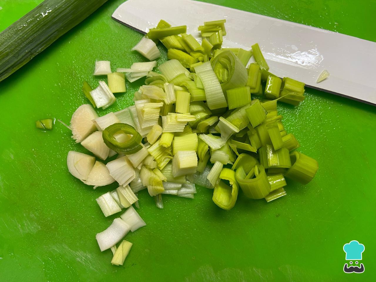 También lava muy bien el puerro y pica. Reserva por separado algunas hojas, que las utilizaremos más adelante para decorar.