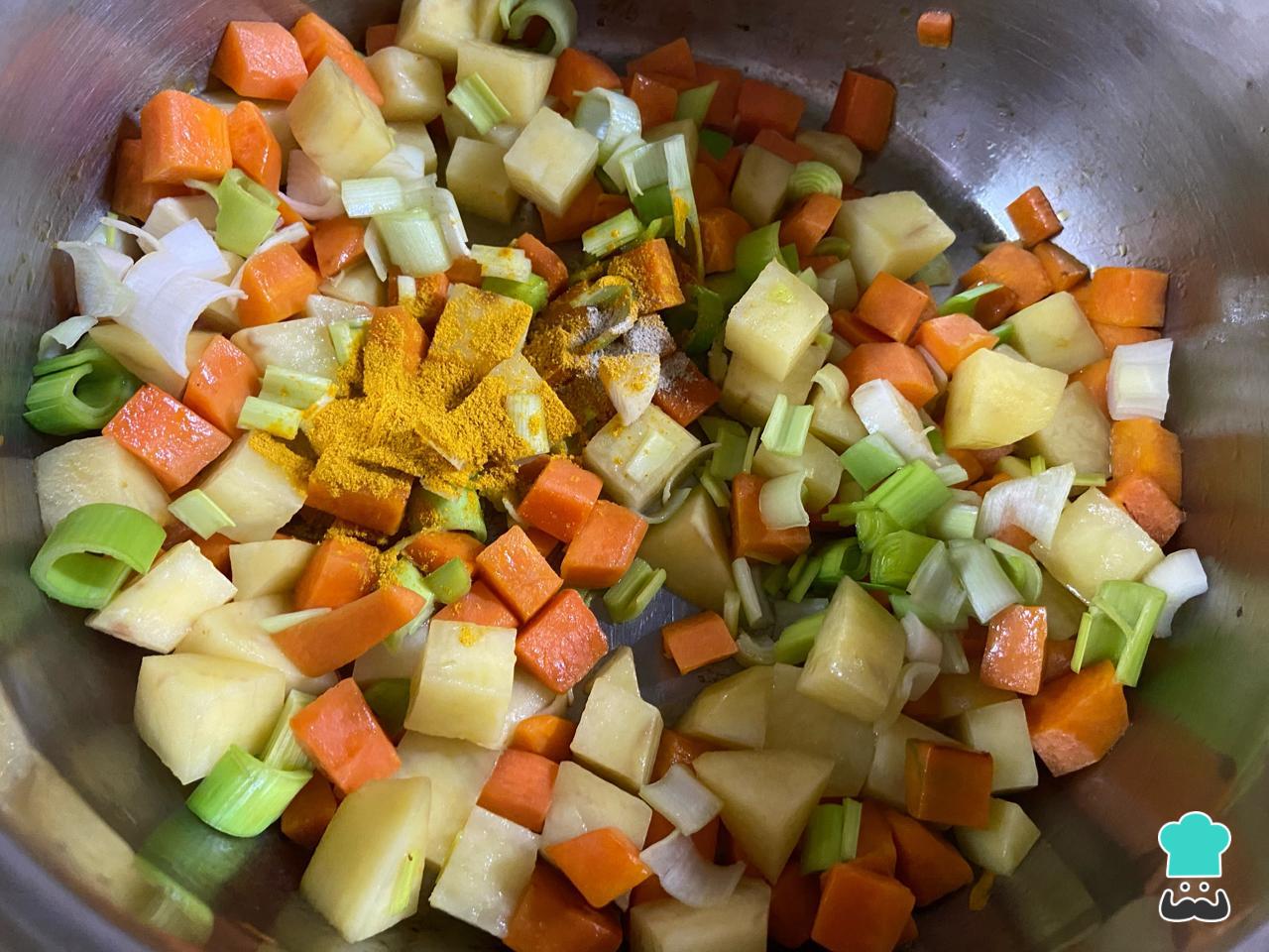 Coloca el aceite de oliva en una olla y lleva al fuego. Cuando se caliente, añade los vegetales troceados, comenzando por la zanahoria, después de 5 minutos la papa y finalmente el puerro. Incorpora también los condimentos y deja rehogar a fuego medio por algunos minutos para sumar sabor a la preparación.