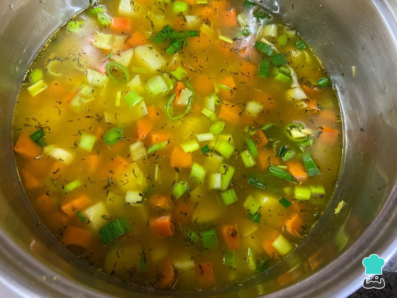 Vierte agua o caldo hasta cubrir los vegetales y deja cocinar por aproximadamente 20 minutos, revolviendo cada tanto. Como la zanahoria es la que más tarda en cocerse, sabrás que todo está hecho cuando al pincharla esté tierna.