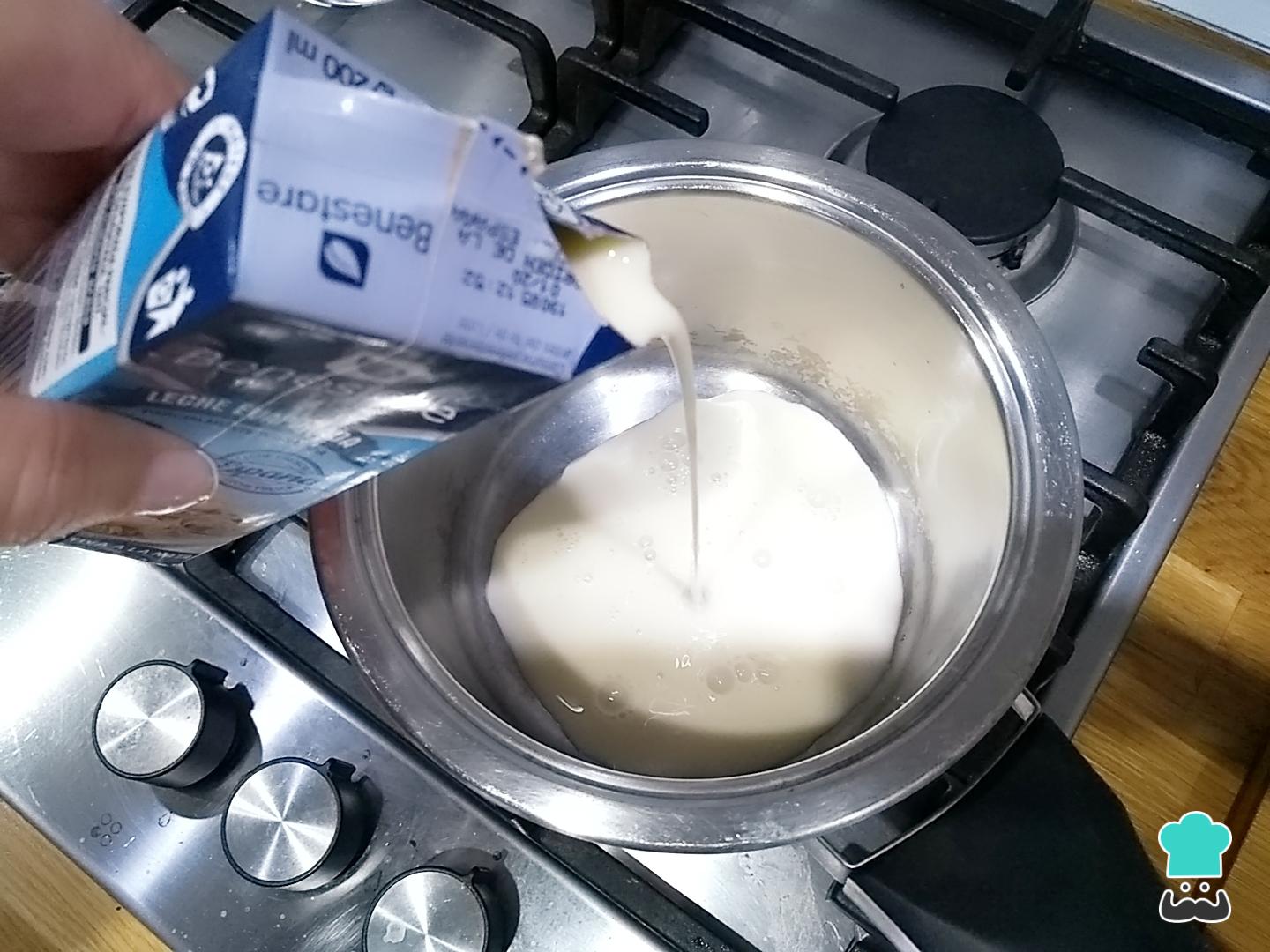 Pon un cazo a calentar a temperatura mínima y añade la leche evaporada. Si no la consigues, puedes utilizar crema de leche en su lugar (nata) o prepararla en casa con esta receta: "Leche evaporada casera".