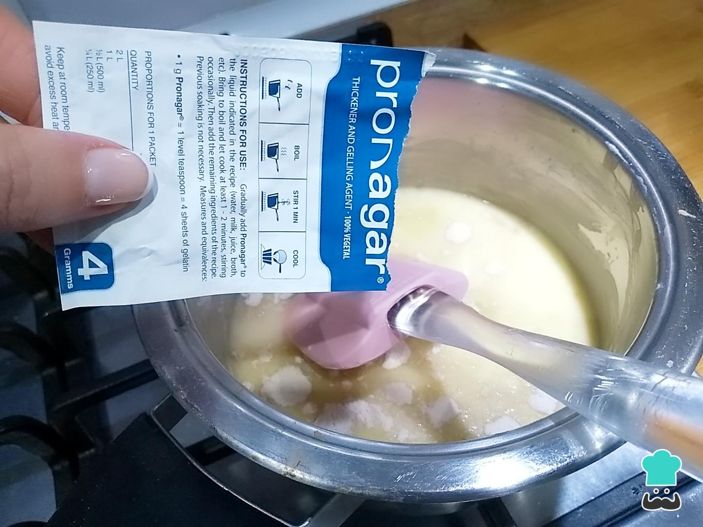 Antes de que se empiece a calentar demasiado la leche evaporada, agrega un sobre de agar-agar en polvo poco a pocoy removiendo para evitar que se produzcan grumos. El agar-agar es de origen vegetal y se extrae de las algas, muy utilizada para múltiples productos y una estupenda opción vegetariana.