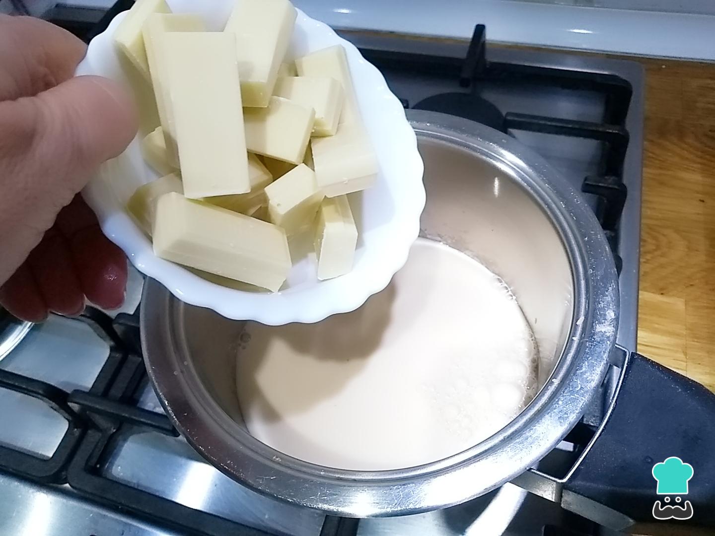 Pasados unos 3 minutos y sin dejar que llegue a hervir, incorpora el chocolate blanco troceado y remueve. Para que se funda correctamente y el cremoso de chocolate blanco quede en su punto, es fundamental no dejar que la preparación hierva.