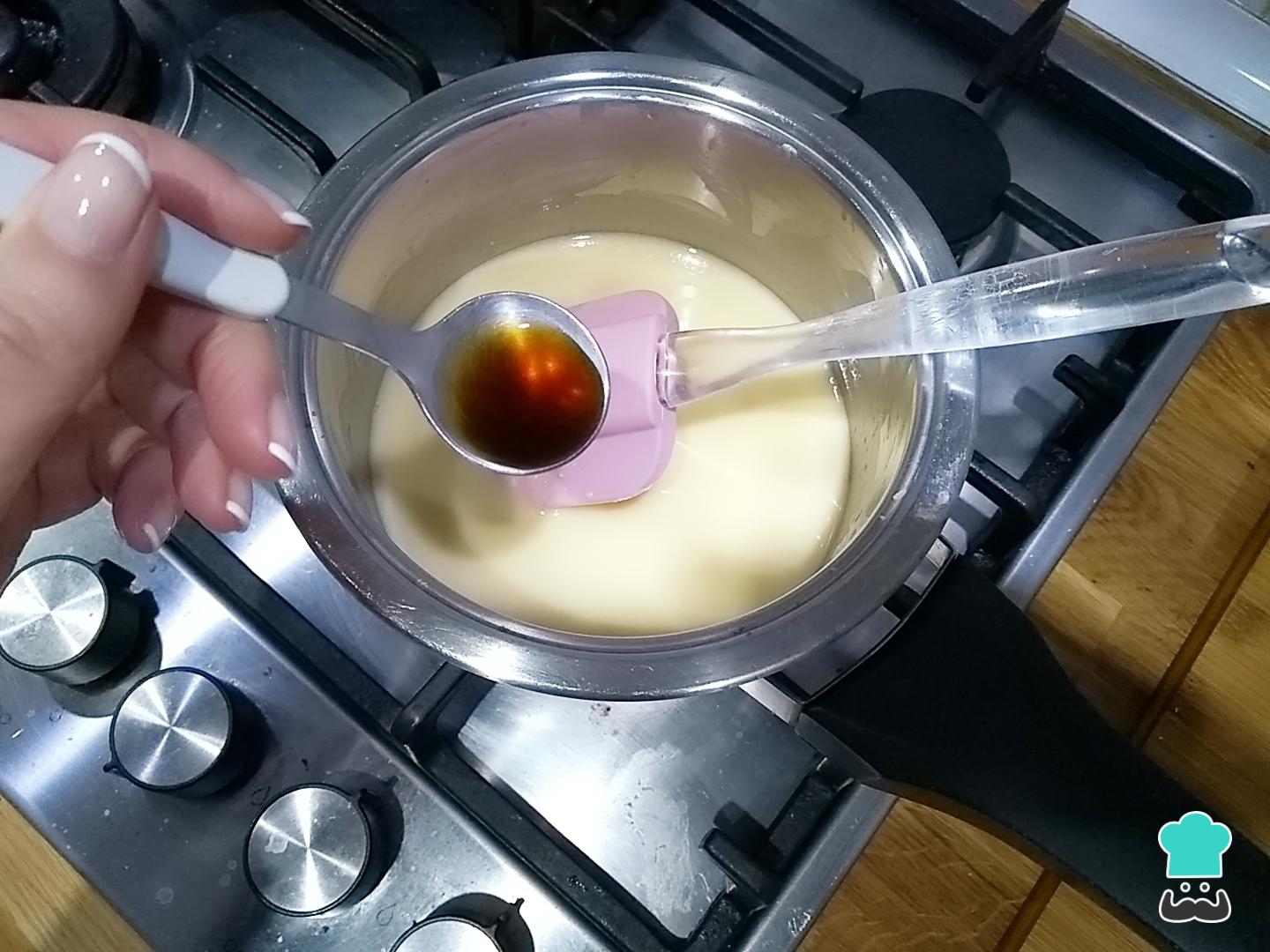 Añade un poquito de vainilla para acentuar el sabor del cremoso de chocolate blanco, remueve y déjalo al fuego otros 3 minutos más.