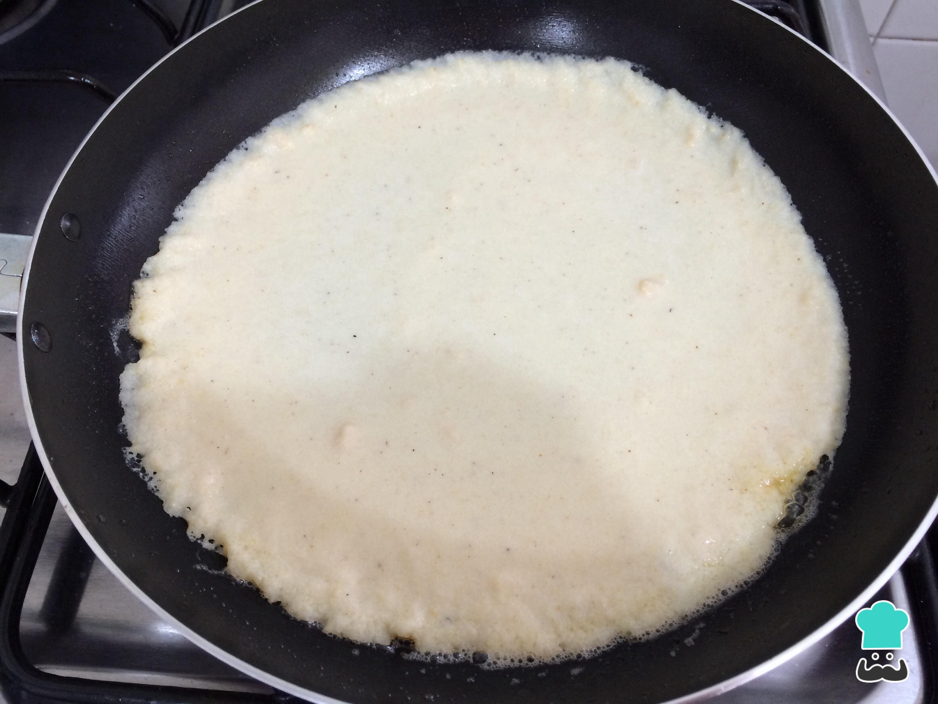 Cuando empiecen a formarse burbujas sobre la superficie de la crepe, la volteamos con cuidado para cocinarla por el otro lado. Repetimos estos pasos para formar todas las crepes con harina de coco y las apilamos en un plato conforme se van haciendo.