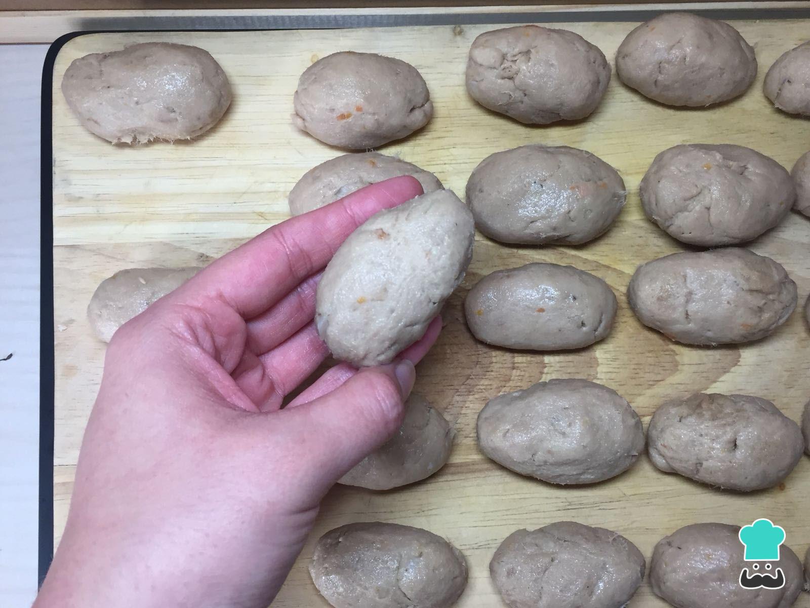 Para hacer las croquetas de carne de ternera coge la masa y haz porciones (del tamaño de una cuchara sopera) y moldea con las manos.
