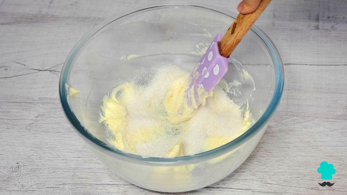 Coloca en un bol o recipiente la mantequilla a temperatura ambiente junto con el azúcar. Mezcla con una espátula de goma o con batidora hasta obtener una crema suave y untable.