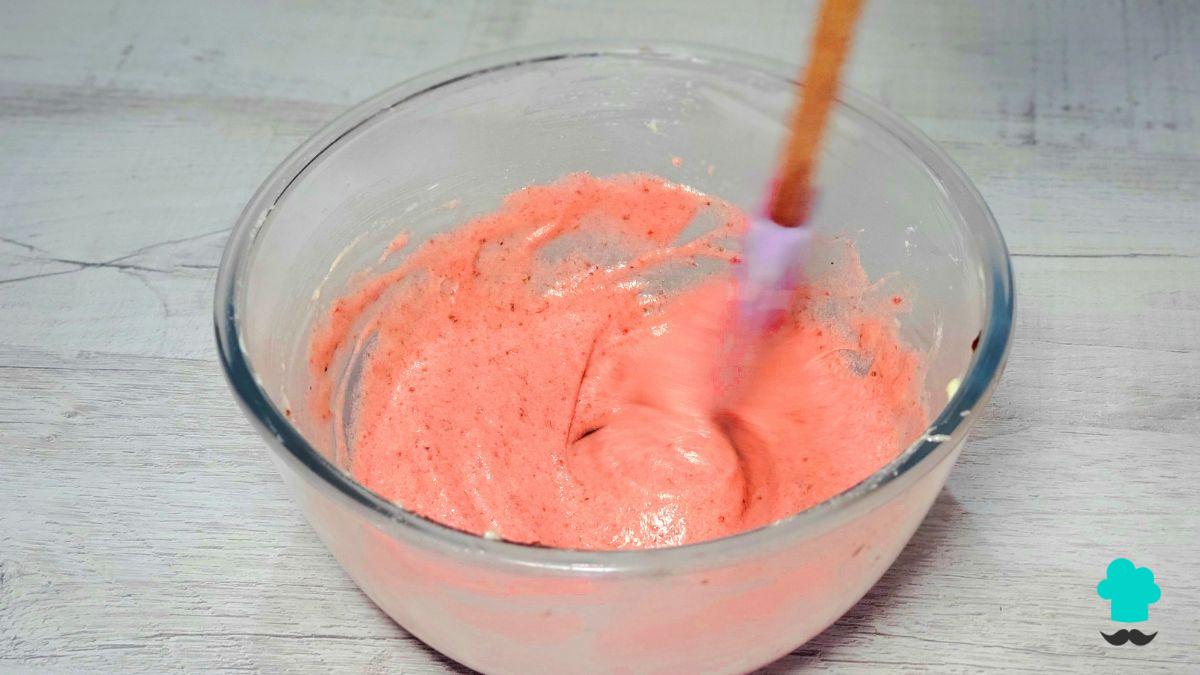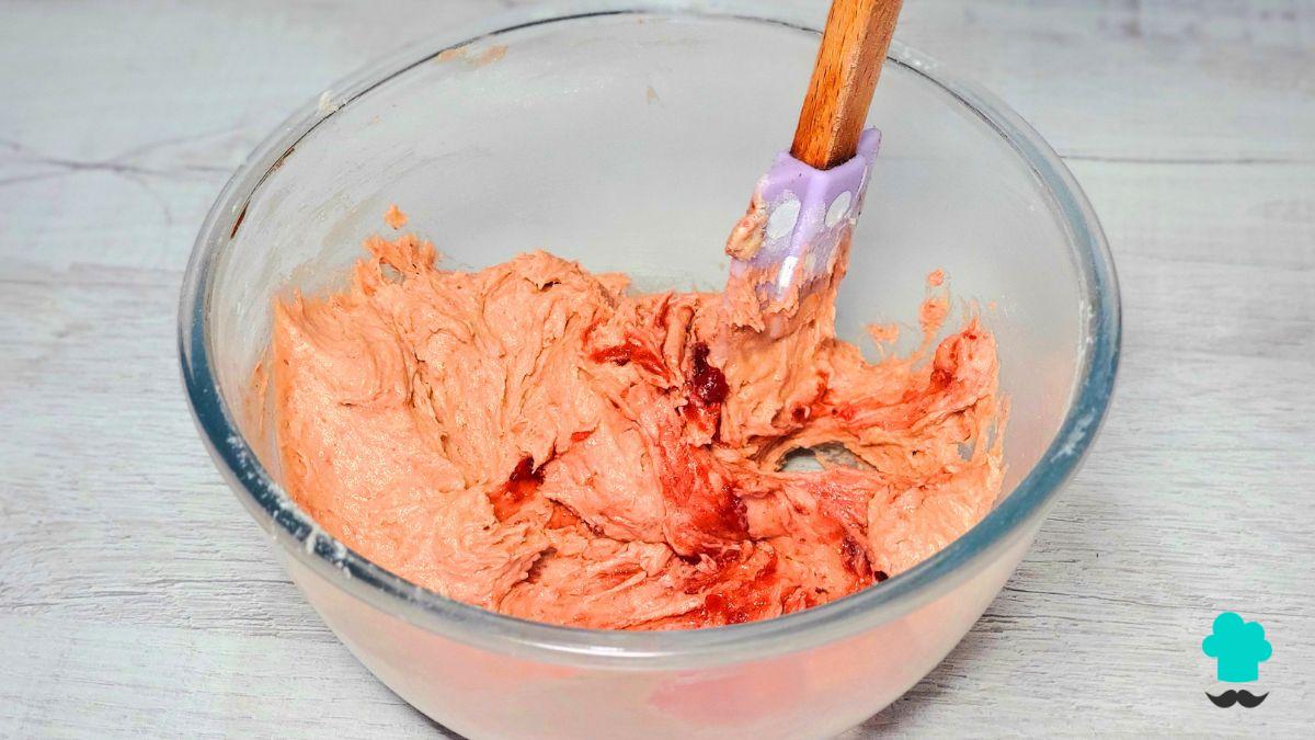 Incorpora el huevo, la esencia de vainilla y el colorante vegetal rojo. La mezcla debe adquirir un tono rojo intenso y brillante, característico del red velvet que se matizará con el cacao en polvo.
