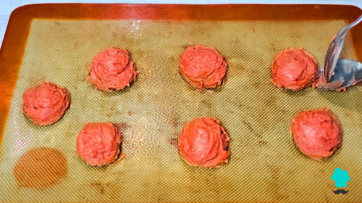 Aplasta ligeramente la superficie para que no queden demasiado redondas; puedes hacerlo con las manos o con el dorso de una cuchara. Colócalas en una bandeja de horno, dejando una separación de unos cuatro dedos entre cada una, ya que durante la cocción se expandirán. Hornea a 180 °C durante unos 12 minutos, hasta que la superficie se vea opaca y al tocarlas la masa esté firme pero aún suave en el interior.