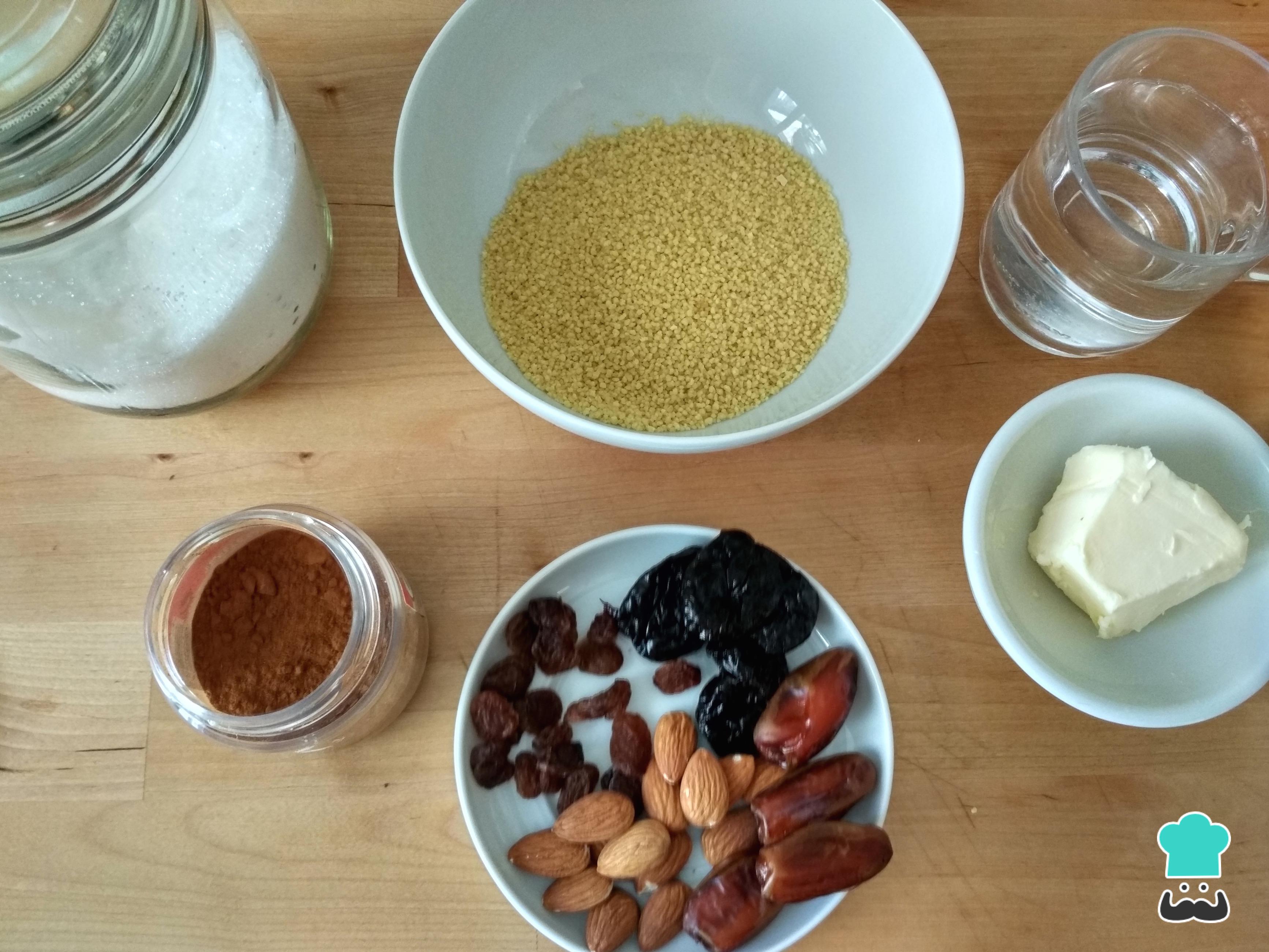 Reunimos todos los ingredientes para elaborar el cuscús dulce marroquí.