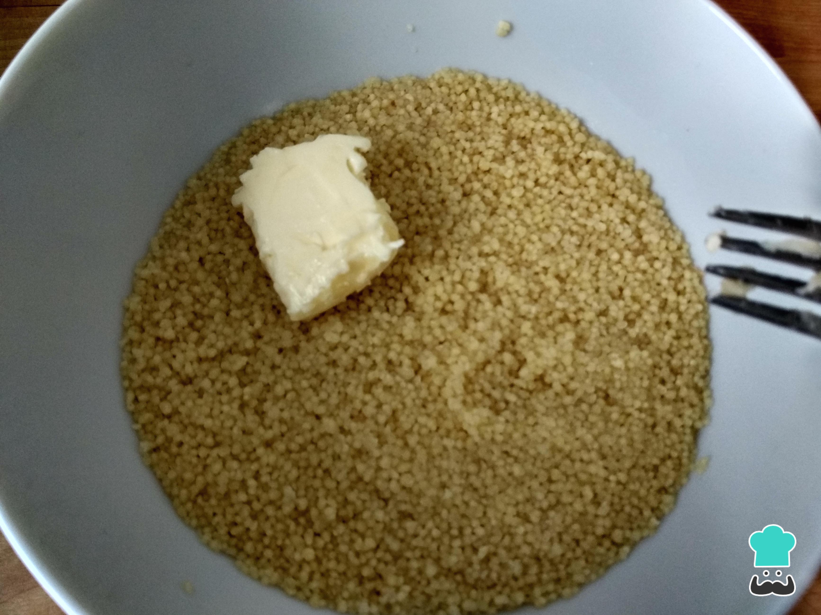 Pasado ese tiempo, agregamos un poco de margarina vegetal o aceite de oliva, y movemos con un tenedor para que se mezcle bien y se separen los granos de cuscús. Dejamos reposar otros 3 minutos.