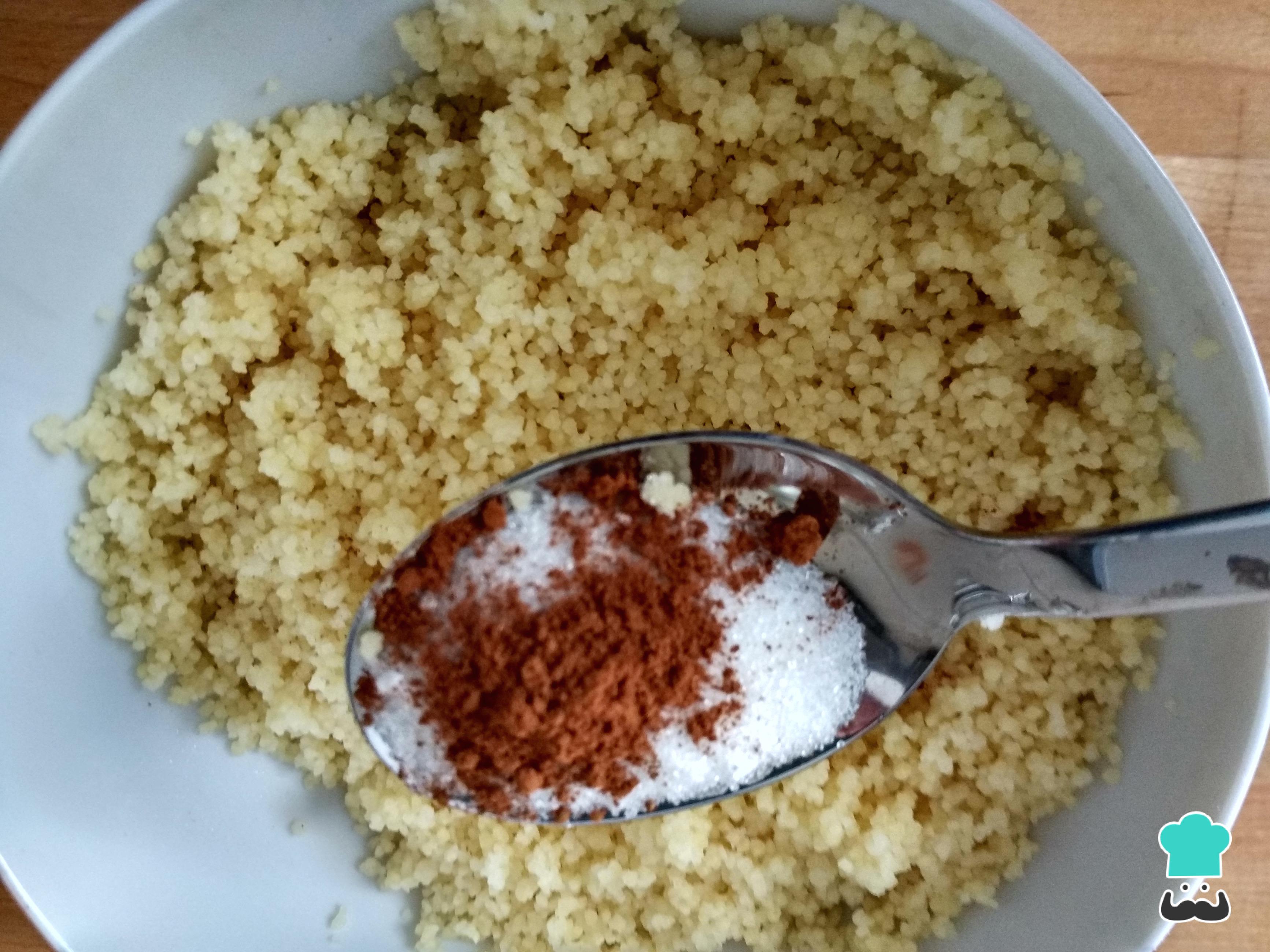 Cuando todavía esté tibio el cuscús, añadimos el azúcar y la canela molida y removemos bien para que se integren los sabores.