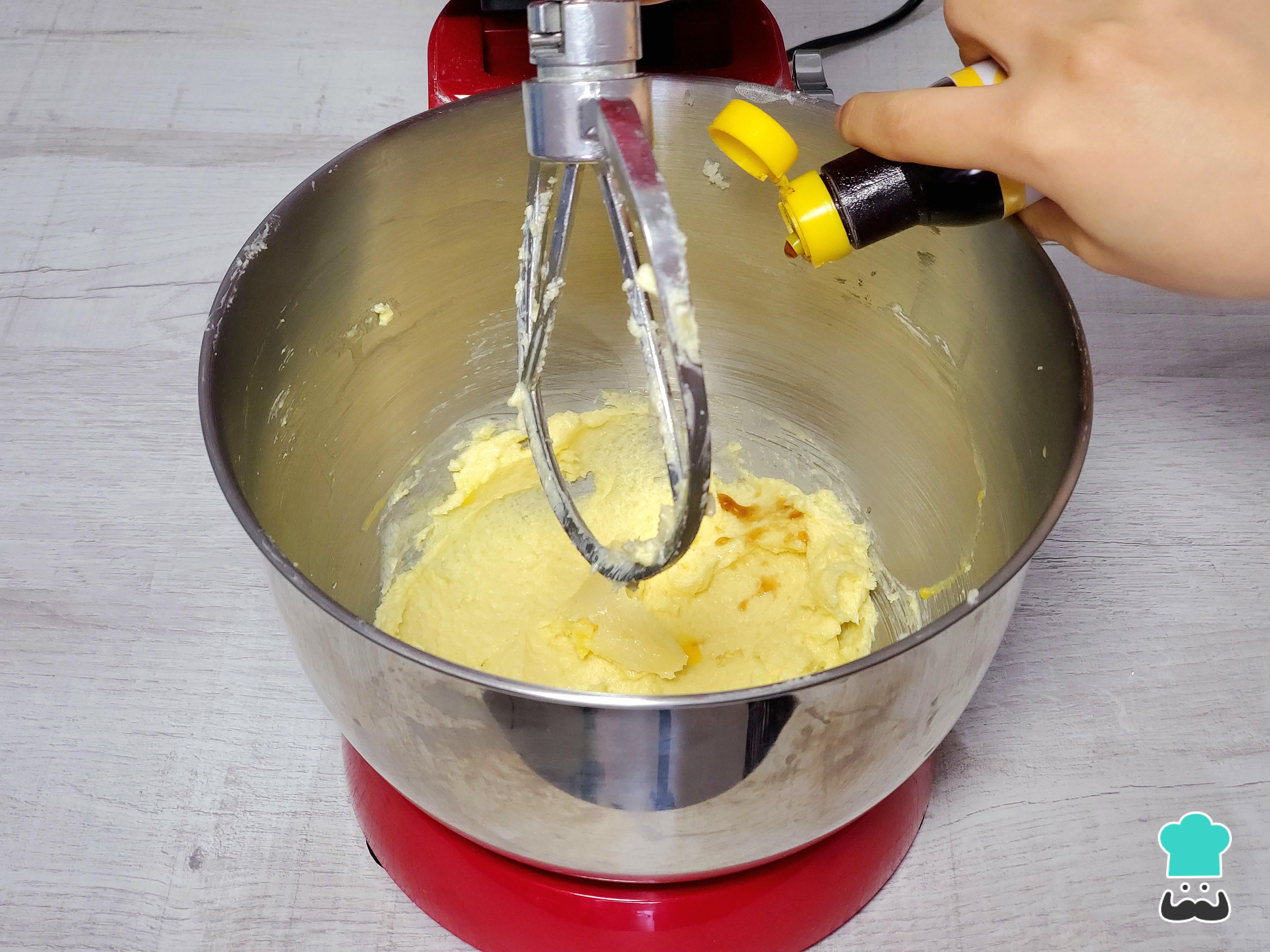 Una vez que el huevo esté bien integrado, añade un chorrito de vainilla para aromatizar la mezcla. También puedes usar la esencia que prefieras o ralladura de naranja o de limón.