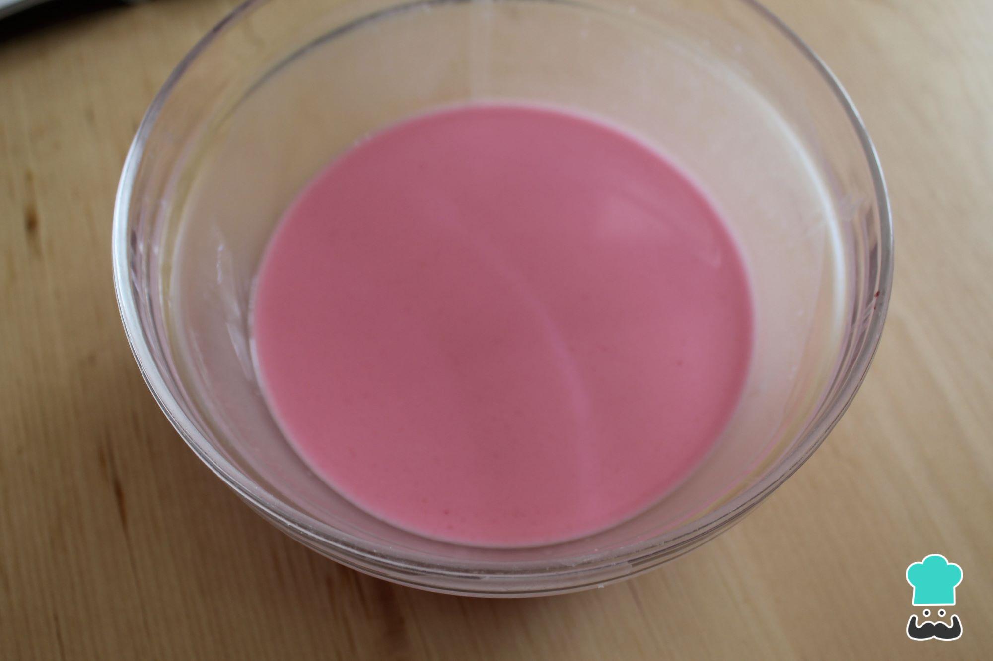 En un bol no muy grande añade los 75 g de fécula de maíz (maicena) con los 150 ml de agua, el agua de azahar (de rosas, vainilla o el que tengas en casa) y el colorante alimenticio rojo. Mezcla bien y reserva para más adelante.