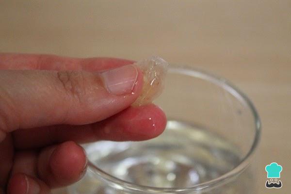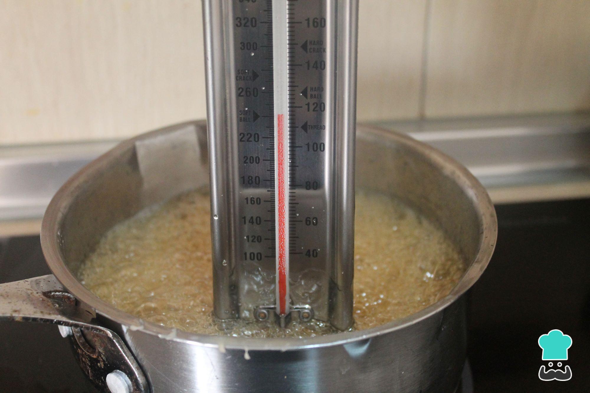 Si no tienes termómetro, no te preocupes, puedes hacerlo sin él. Tardará entre 20-30 minutos, dependerá de tu fuego. Para comprobar que el azúcar está en punto de bola blando, retira una cucharadita del sirope y deja caer en un vaso con un poco de agua. Luego, introduce los dedos en él y mira si puedes extraer el sirope vertido y si puedes hacer con él una bola blanda de caramelo. Si ves que no lo puedes coger con los dedos, es porque todavía no está y aún le falta. Por otro lado, si ves que lo coges, pero no forma bola, le falta menos. Por el contrario, haces una bola dura, es que te has pasado del punto, por ello, es mejor empezar a mirarlo a partir de los 15 minutos de cocción.