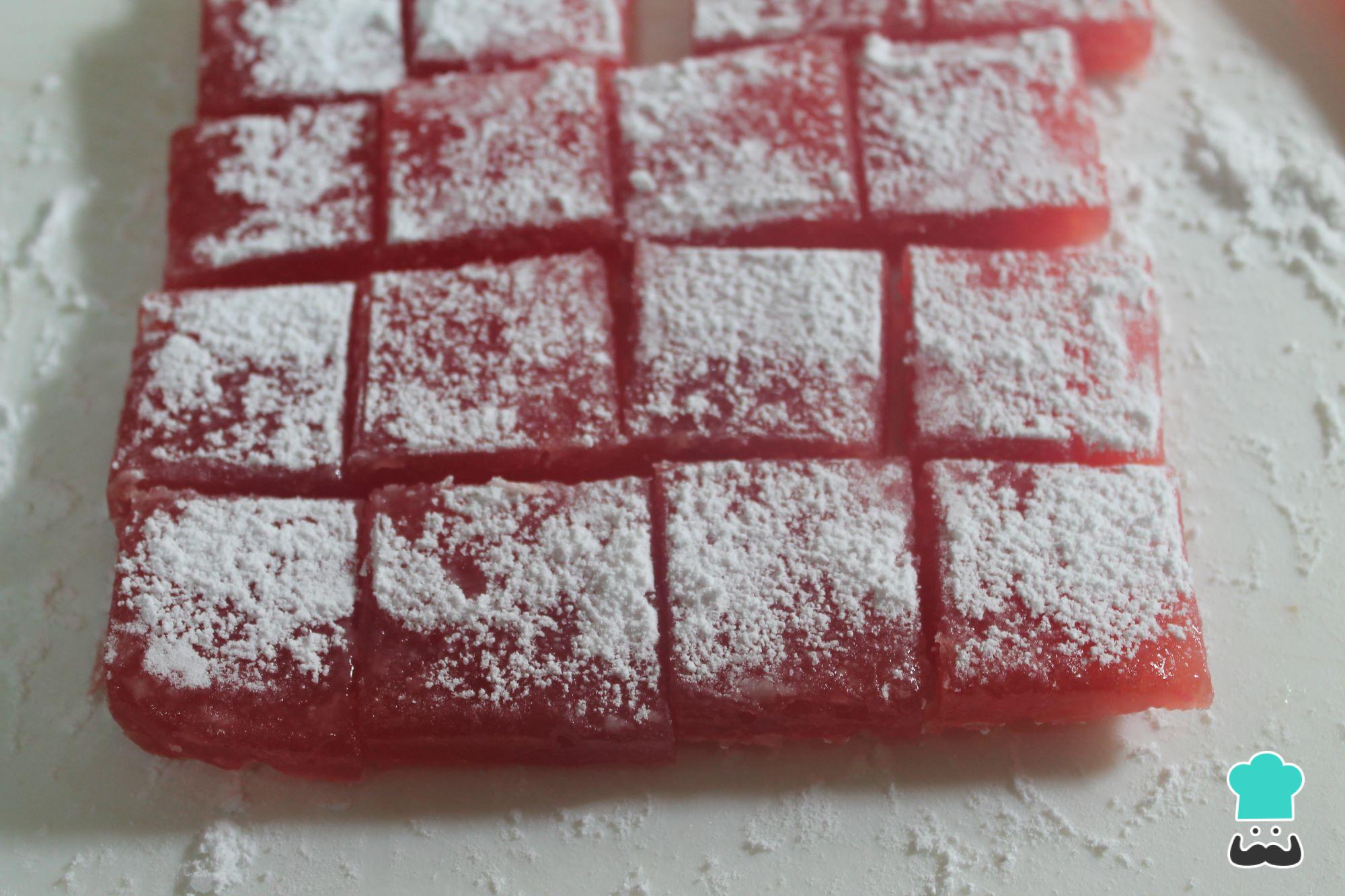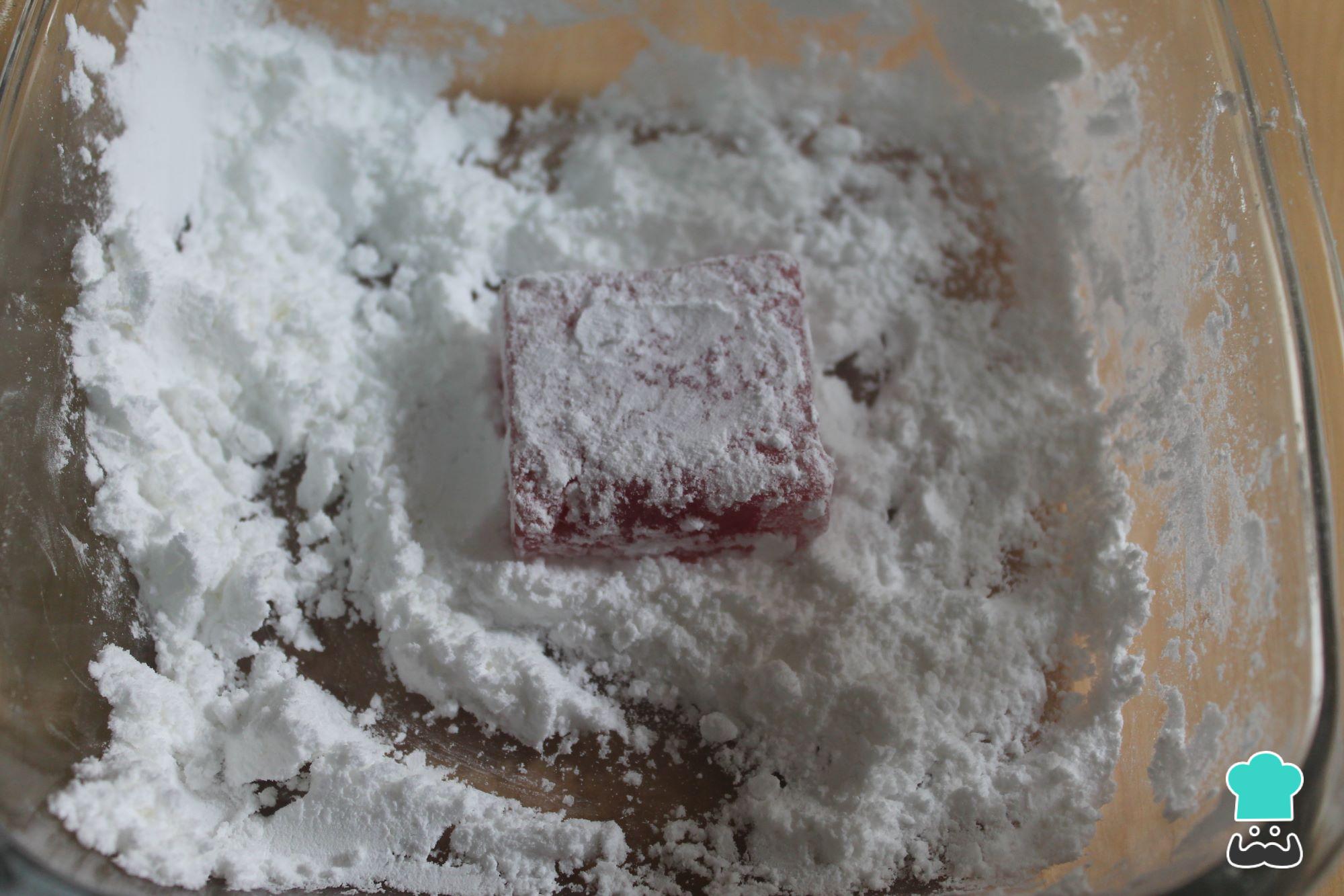 Pasadas las 24 horas de reposo, desmolda el bloque de delicias turcas, espolvorea si es necesario con un poco más de la mezcla de maicena y azúcar glass que tenías. Con un cuchillo engrasado con un poquito de aceite, corta tiras a lo largo y a su vez tiras a lo ancho para formar pequeños cubos.