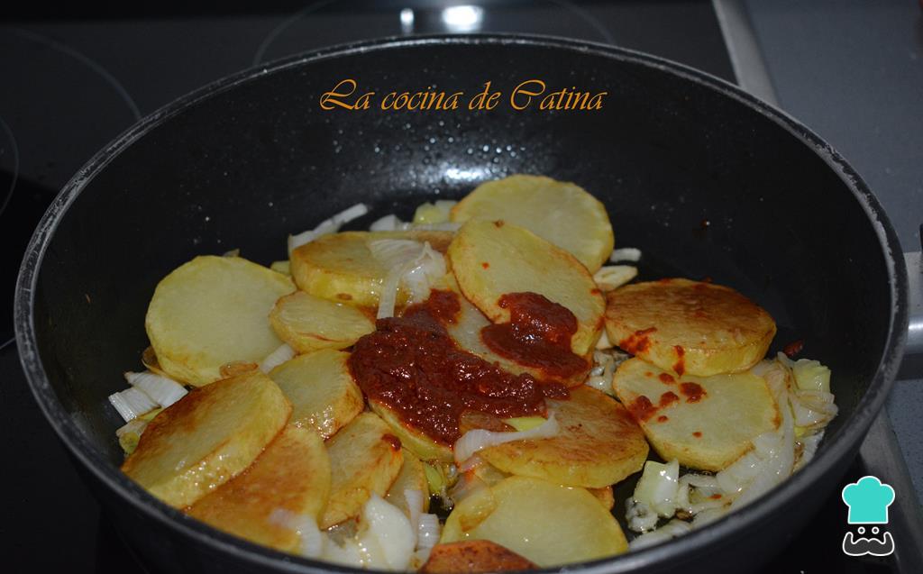 Calentamos el aceite en una sartén y freímos primero las patatas, en el mismo aceite las cebolletas y los ajos. Cuando estén la cebolla y los ajos pochados, incorporamos las patatas, la pulpa de los pimientos, el laurel, sal, pimienta y una pizca de eneldo.