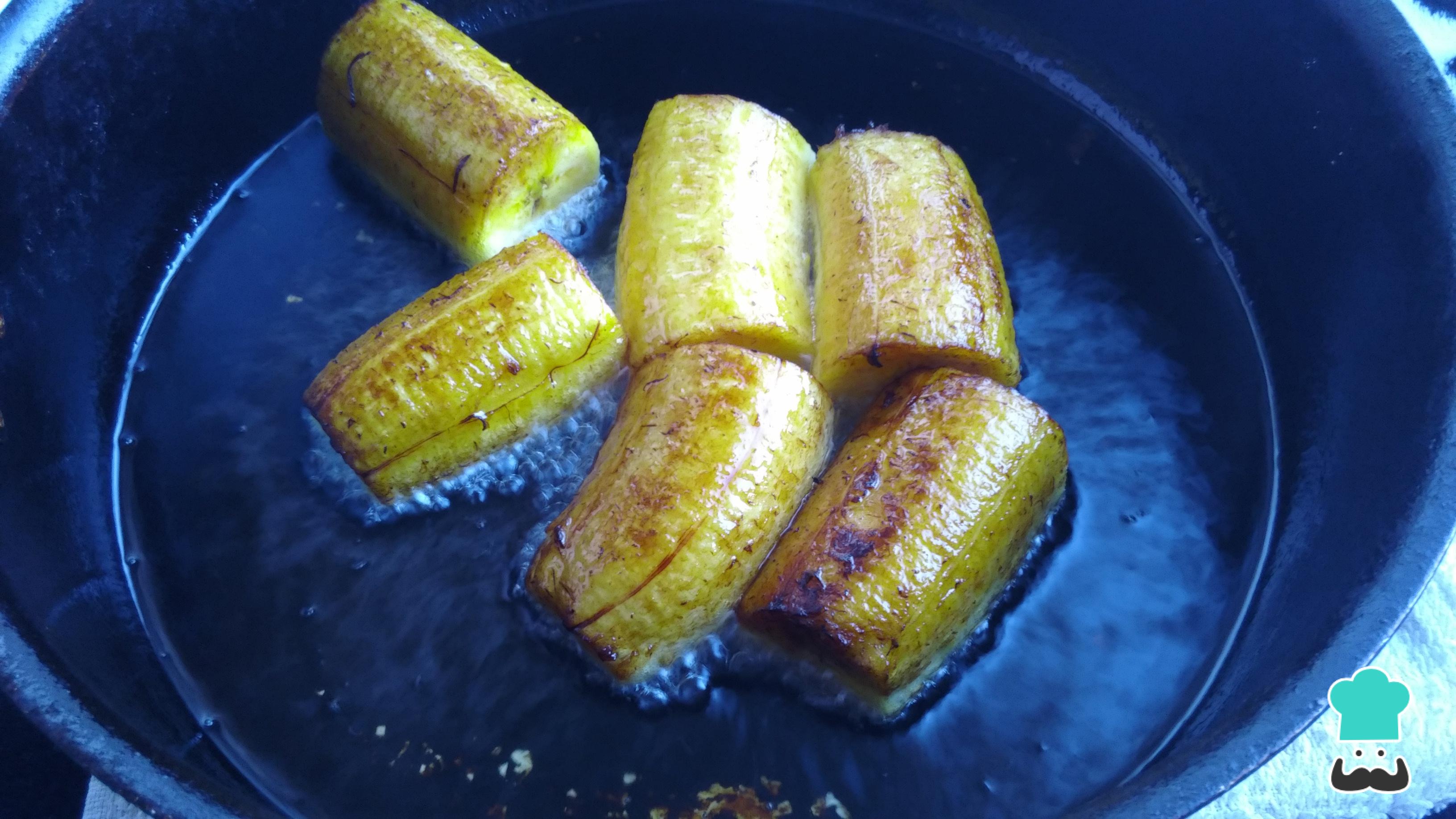 En abundante aceite, fríe todos los trozos de plátano. Dora los plátanos completamente y muévelos de forma constante para evitar que se quemen. Esto es importante si el plátano es ancho, para que se cocine bien por dentro.