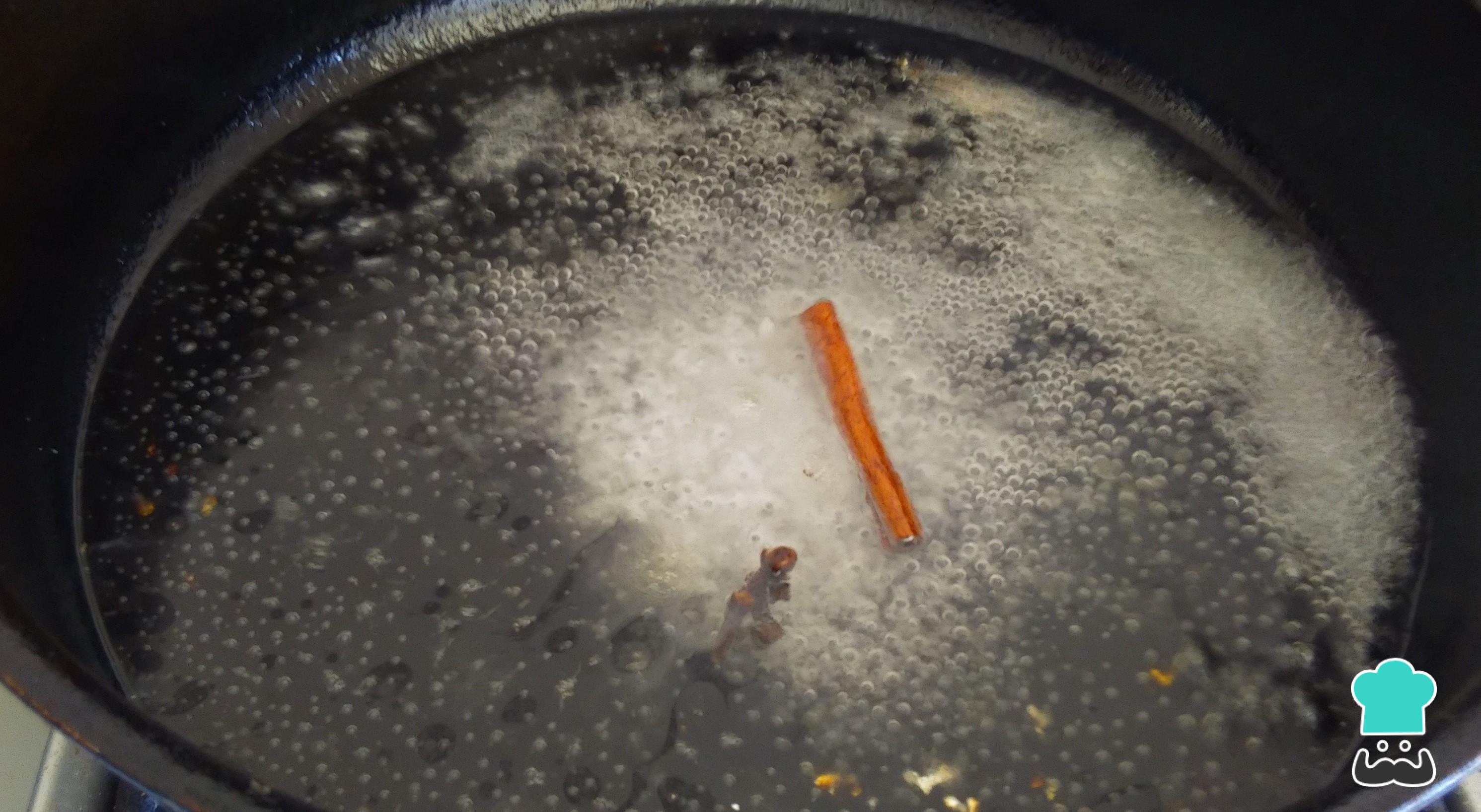 En la misma sartén donde freíste los plátanos, retira la mayor parte del aceite y añade ¾ de la taza de agua (reserva el otro cuarto), el azúcar, la canela y los clavos.