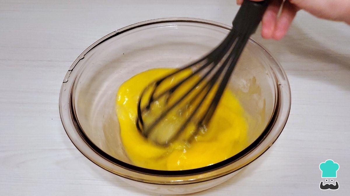 Empieza mezclando en un bol los huevos, el azúcar y el aceite. Remueve bien utilizando un batidor de globo. Esta receta es sencilla y no requiere batidora eléctrica.