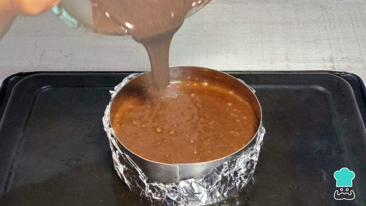 Vuelca en un molde de 23 cm de diámetro previamente enmantequillado y con un disco de papel vegetal en la base para facilitar el desmolde. Hornea a 175 °C durante 1 hora, o hasta que al introducir un palillo este salga completamente limpio.