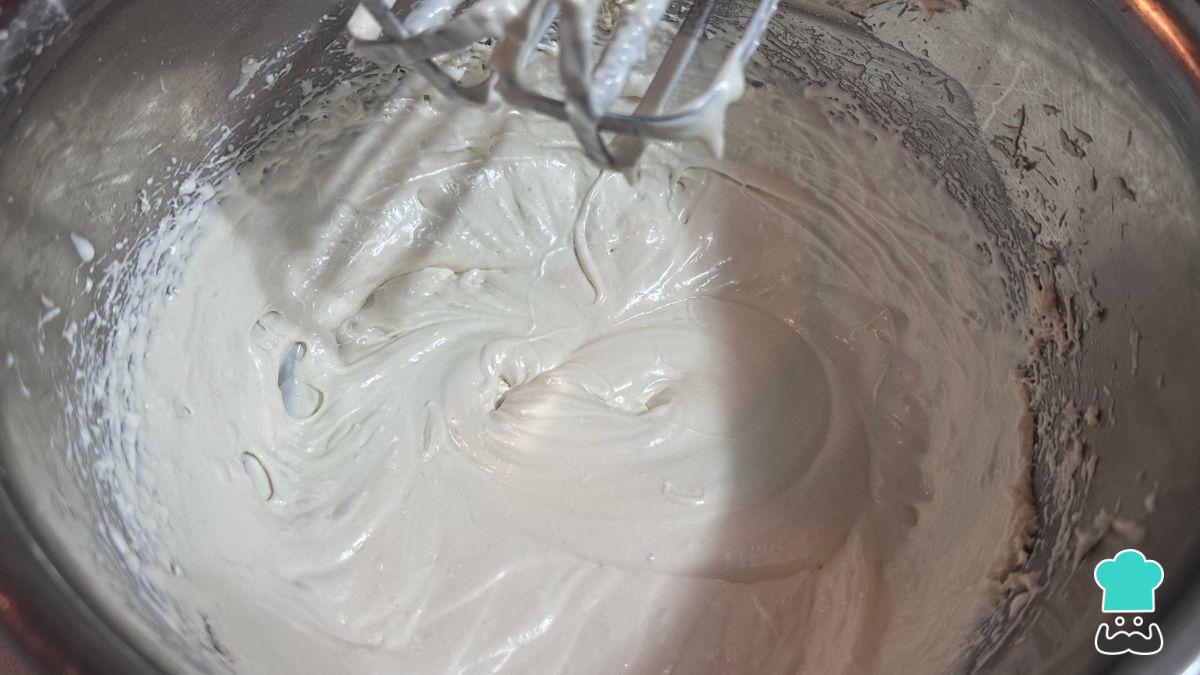 Luego incorpora esta mezcla a la crema batida, hazlo suavemente para mantener la textura aireada. La crema final debe quedar espesa, suave y muy cremosa.