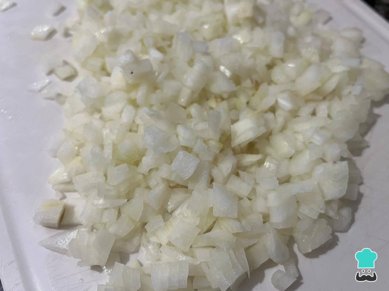 Para empezar con la preparación de las empanadas veganas, pela y pica la cebolla bien chiquita.