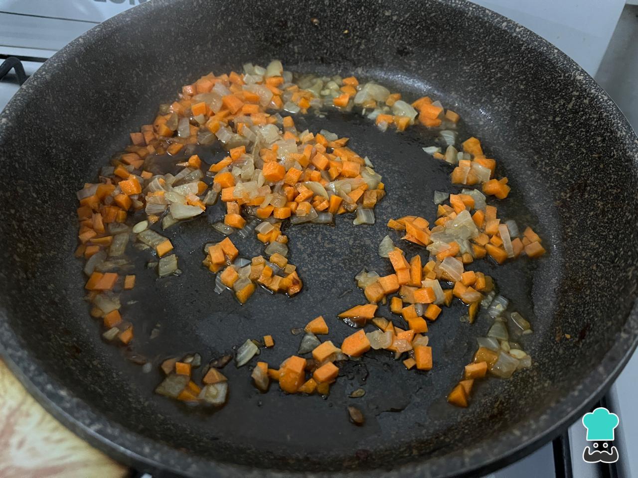 Saltea la cebolla en la sartén a fuego máximo con 1 cucharadita de aceite. Mientras, pela y corta en cubos la zanahoria para añadirla al salteado, una vez que la cebolla esté transparente. Baja el fuego al medio y cocina hasta que los vegetales estén tiernos y dulces.