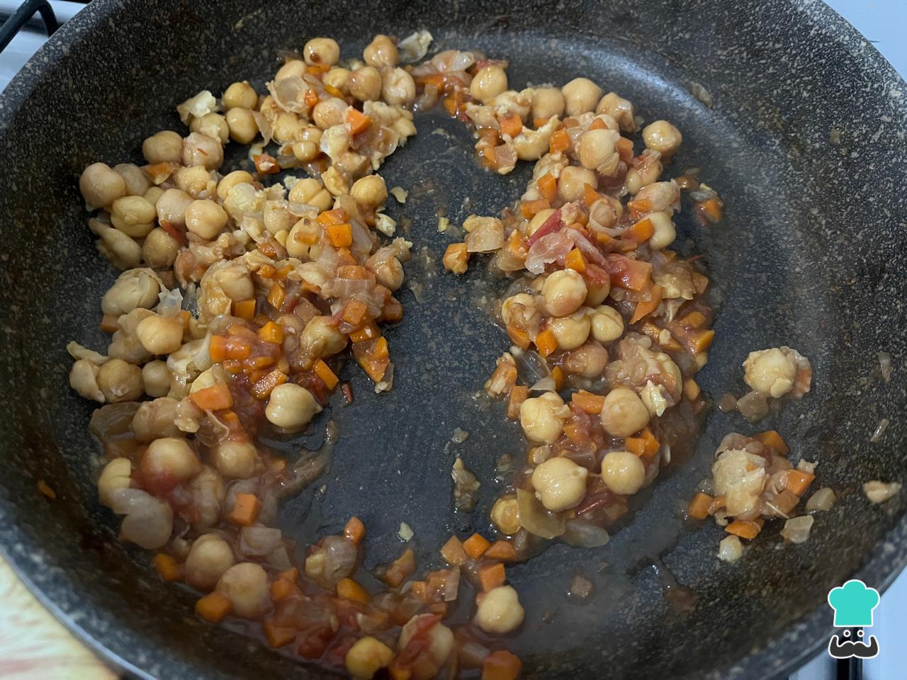Cuando las verduras estén cocidas, agrega los garbanzos enjuagados. Si deseas, puedes usar secos en lugar de lata. Para ello, remójalos la noche anterior, cambia el agua y hiérvelos hasta que estén tiernos con una hoja de laurel para mejorar su digestión. Saltea unos minutos para dar sabor.