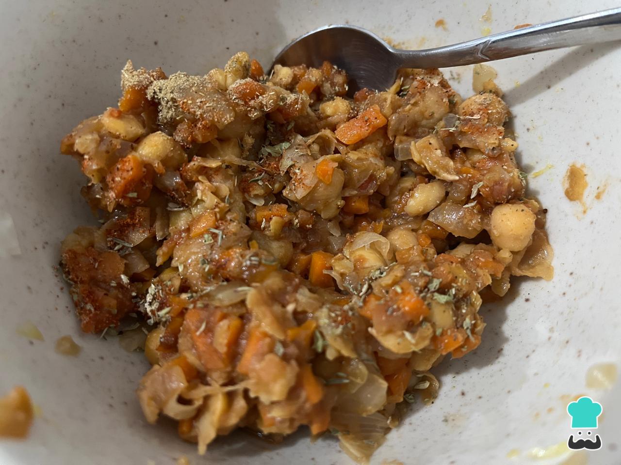 Condimenta el relleno de las empanadas veganas. En este caso hemos combinado cúrcuma, ají molido, comino y tomillo, pero puedes agregar queso vegano, maní picado, orégano, pimentón o nuez moscada.