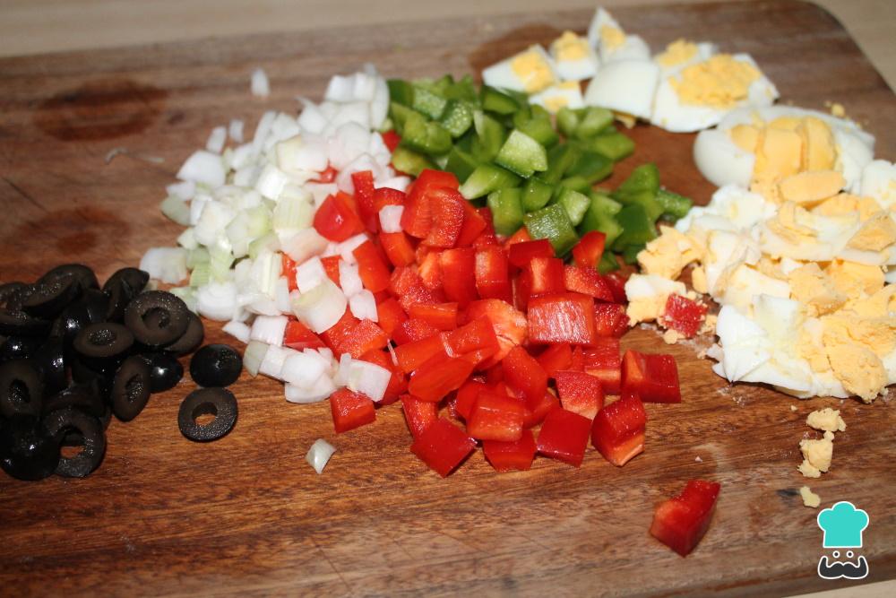Lava los pimientos y corta un trozo, no lo uses todo, puedes utilizar pimiento al gusto dependiendo de tus preferencias. Trocea los pimientos, también debes hacer lo mismo con la cebolla tierna. Seguidamente, lamina las aceitunas. Finalmente, pela los huevos y trocea igualmente.