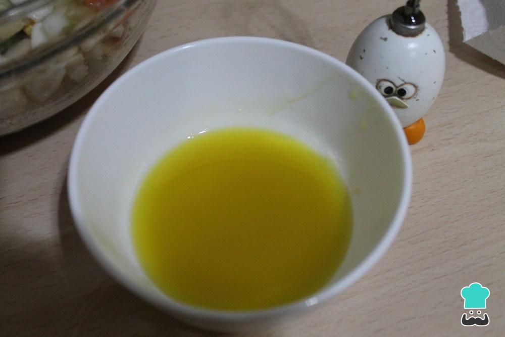 En un pequeño bol pon las cucharadas de aceite de oliva comentadas anteriormente junto con el vinagre y dos pizcas de sal. Bate con un tenedor para que quede bien mezclado. Puedes añadir más o menos vinagre, según tus gustos.