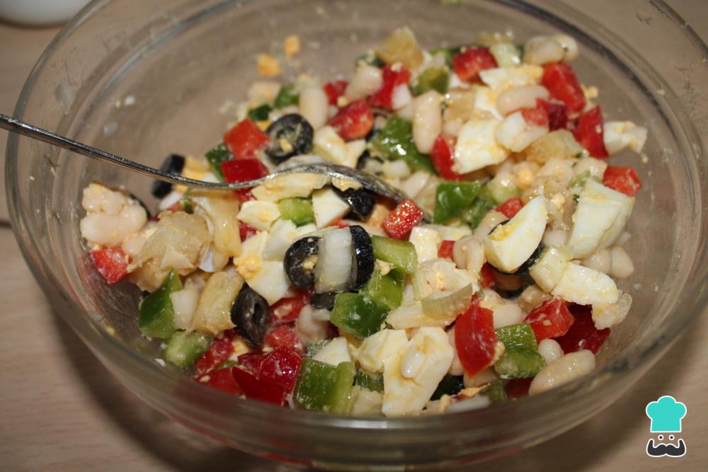 En un bol pon las alubias junto con las verduras picadas y las aceitunas. Trocea con las manos las tiras de bacalao desalado. Riégalo todo con el aliño de aceite, vinagre y sal y mézclalo bien. Reserva para que los ingredientes vayan cogiendo sabor.
