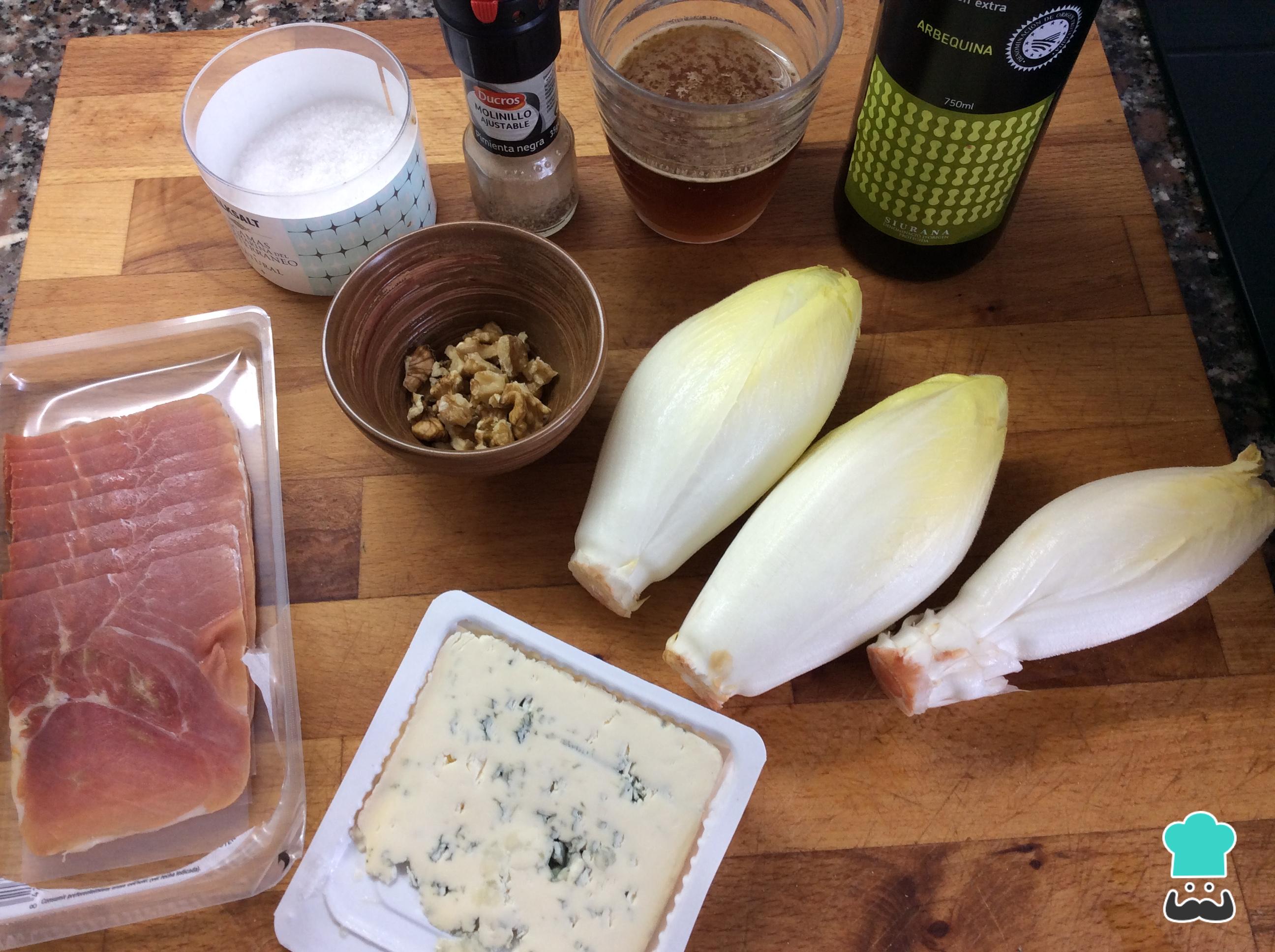 Preparamos los ingredientes para las endivias con jamón serrano, que también llevan algo de queso roquefort o queso azul y unas nueces (opcionales).