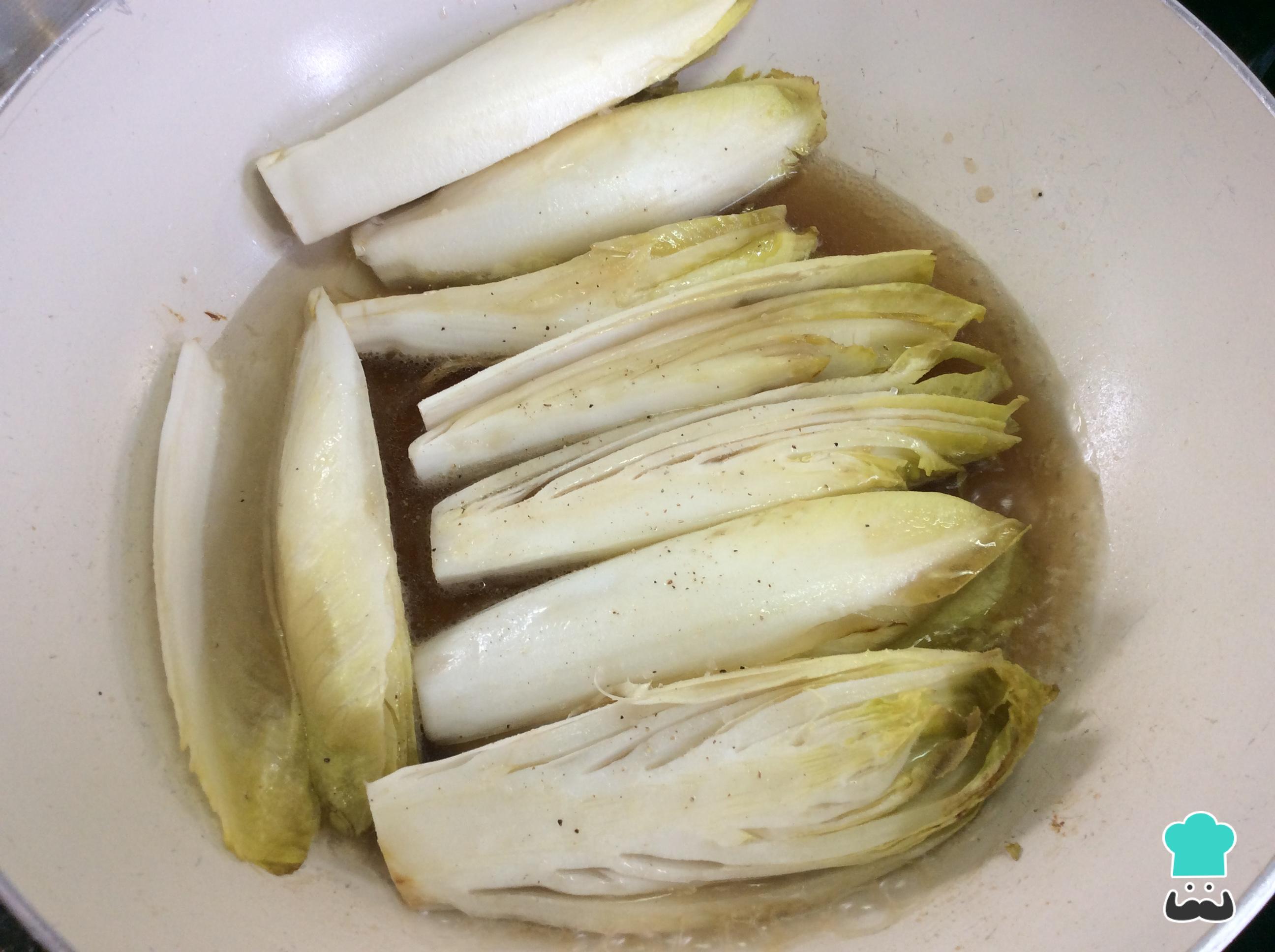 En primer lugar, desechamos las hojas externas de las endivias, las lavamos, las secamos con algo de papel de cocina, cortamos la punta y las partimos por la mitad. Mientras, calentamos en una sartén un chorrito de aceite de oliva y, cuando esté caliente, introducimos las endivias para marcarlas ligeramente por todos los lados. A continuación, vertemos el caldo de verduras y salpimentamos (sin pasarse con la sal, el queso roquefort y el jamón serrano harán el resto); dejamos que las verduras se cuezan durante unos 15 minutos, a fuego medio.