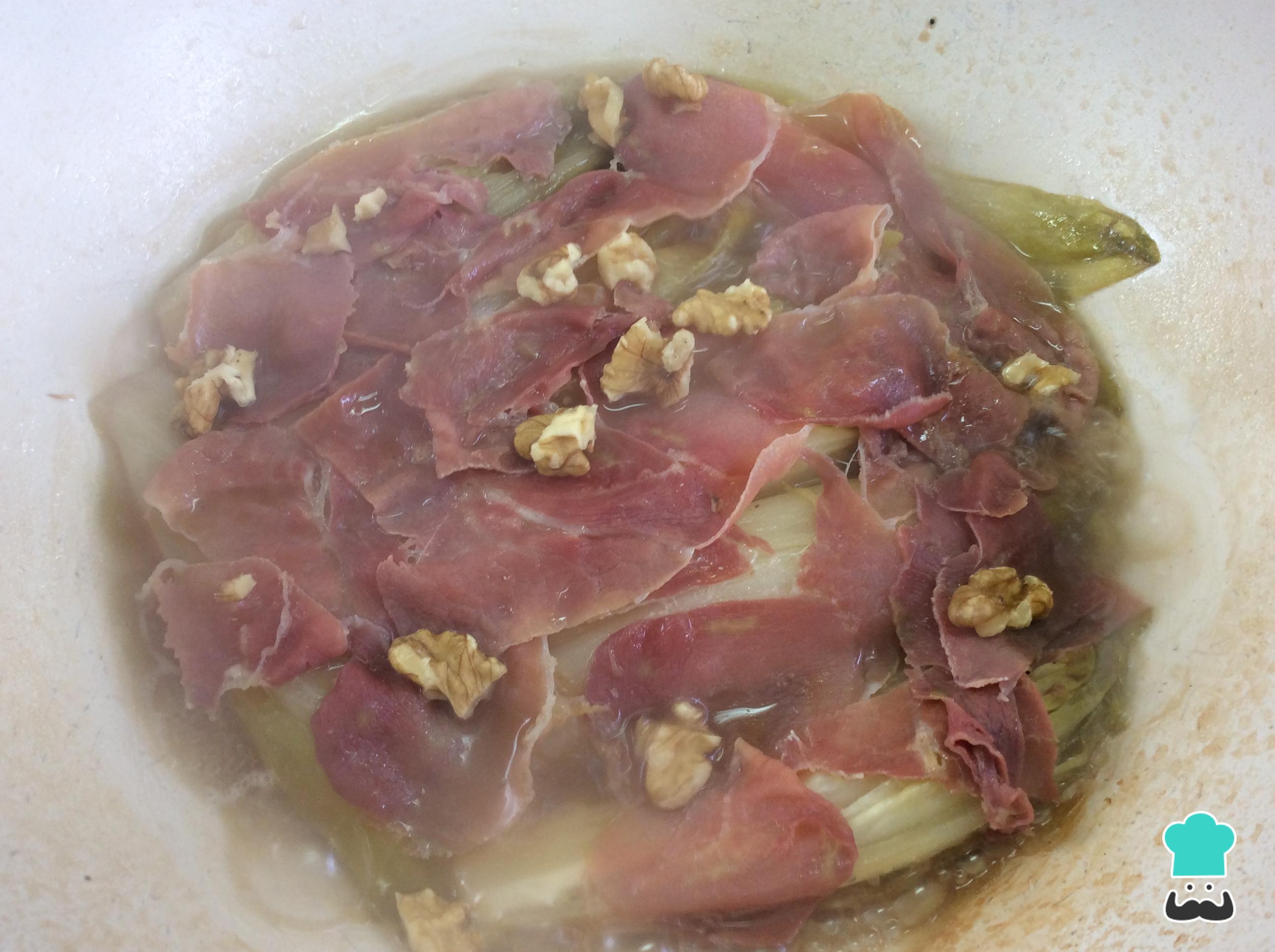 A continuación, añadimos las lonchas de jamón serrano, cubriendo las endivias, y lo dejamos unos cinco minutos más al fuego, para que los aromas se distribuyan. Luego añadimos las nueces y esperamos un par de minutos antes de retirarlo del fuego, mientras el caldo se va reduciendo.