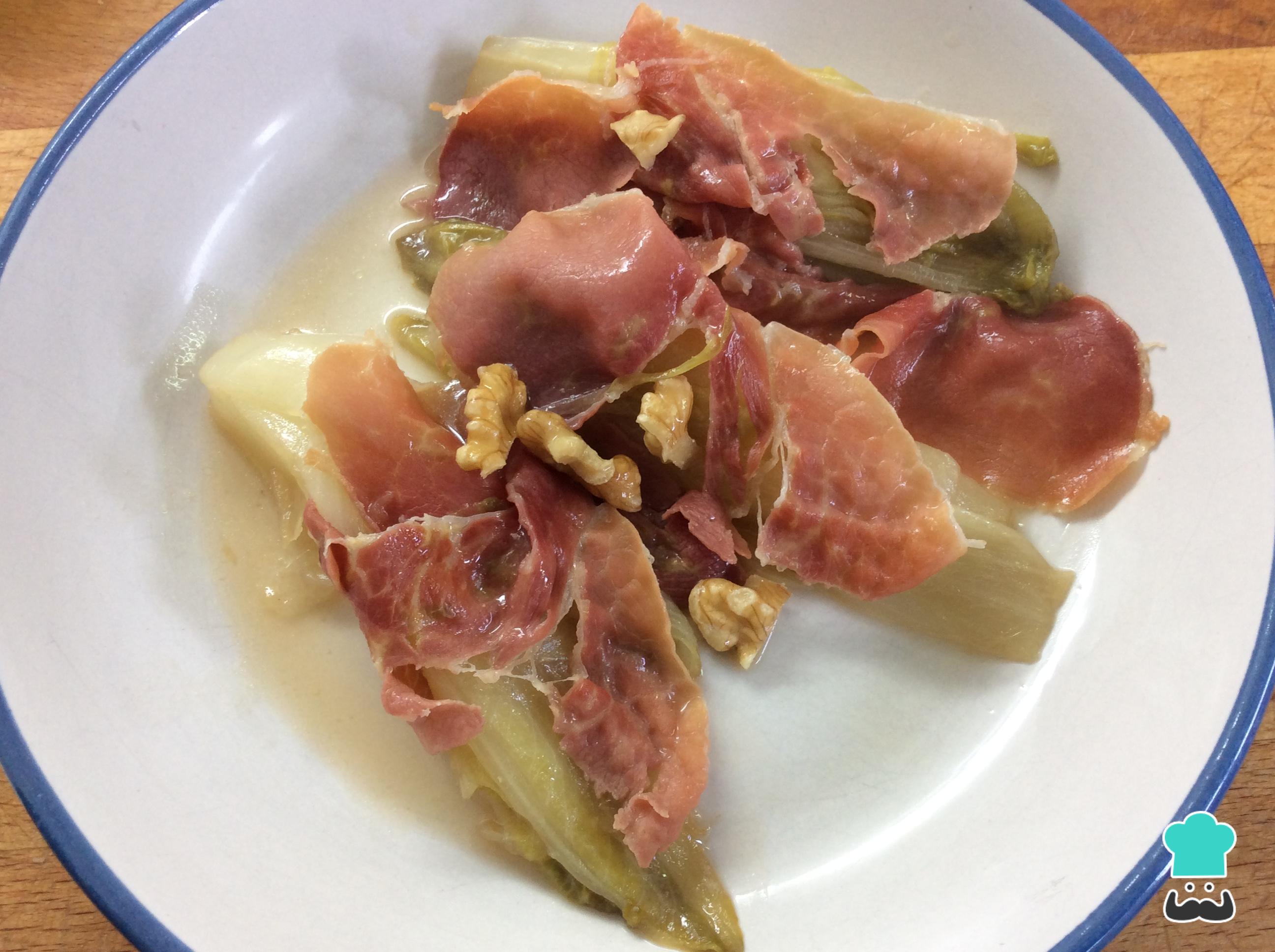 Servimos las endivias con jamón serrano y nueces en un plato hondo, y las regamos ligeramente con el caldo de la sartén.
