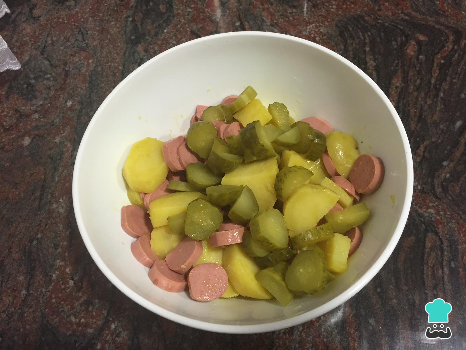 Cortamos las salchichas y las añadimos a las patatas. Aunque se salga ligeramente de la receta original, si la ensalada la van a consumir niños te animamos a que consultes cómo hacer salchichas con forma de pulpo, ¡les encantarán!