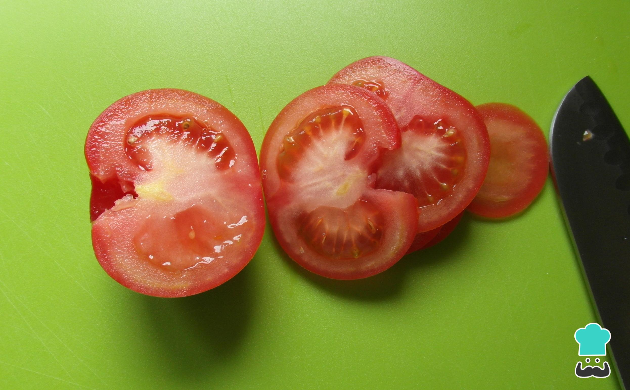 Una vez lista la salsa pesto, lava los tomates y córtalos en rodajas finas, tal y como se observa en la fotografía.