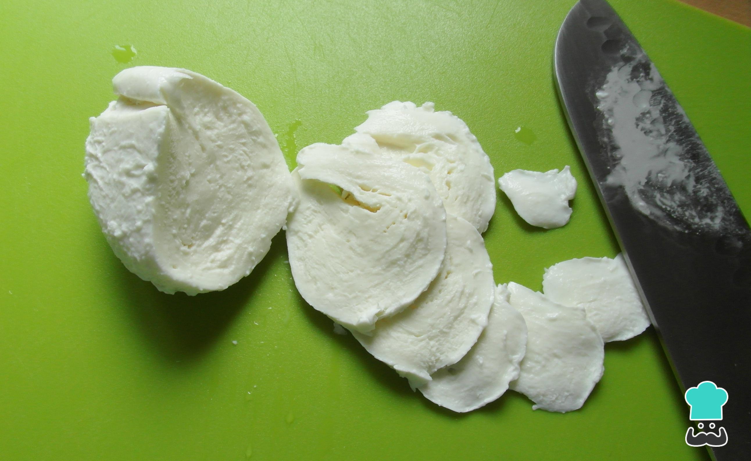 Corta la mozzarella fresca también en rodajas finas, intentando que tengan el mismo grosor que las rodajas de tomate para que la ensalada caprese quede perfecta.