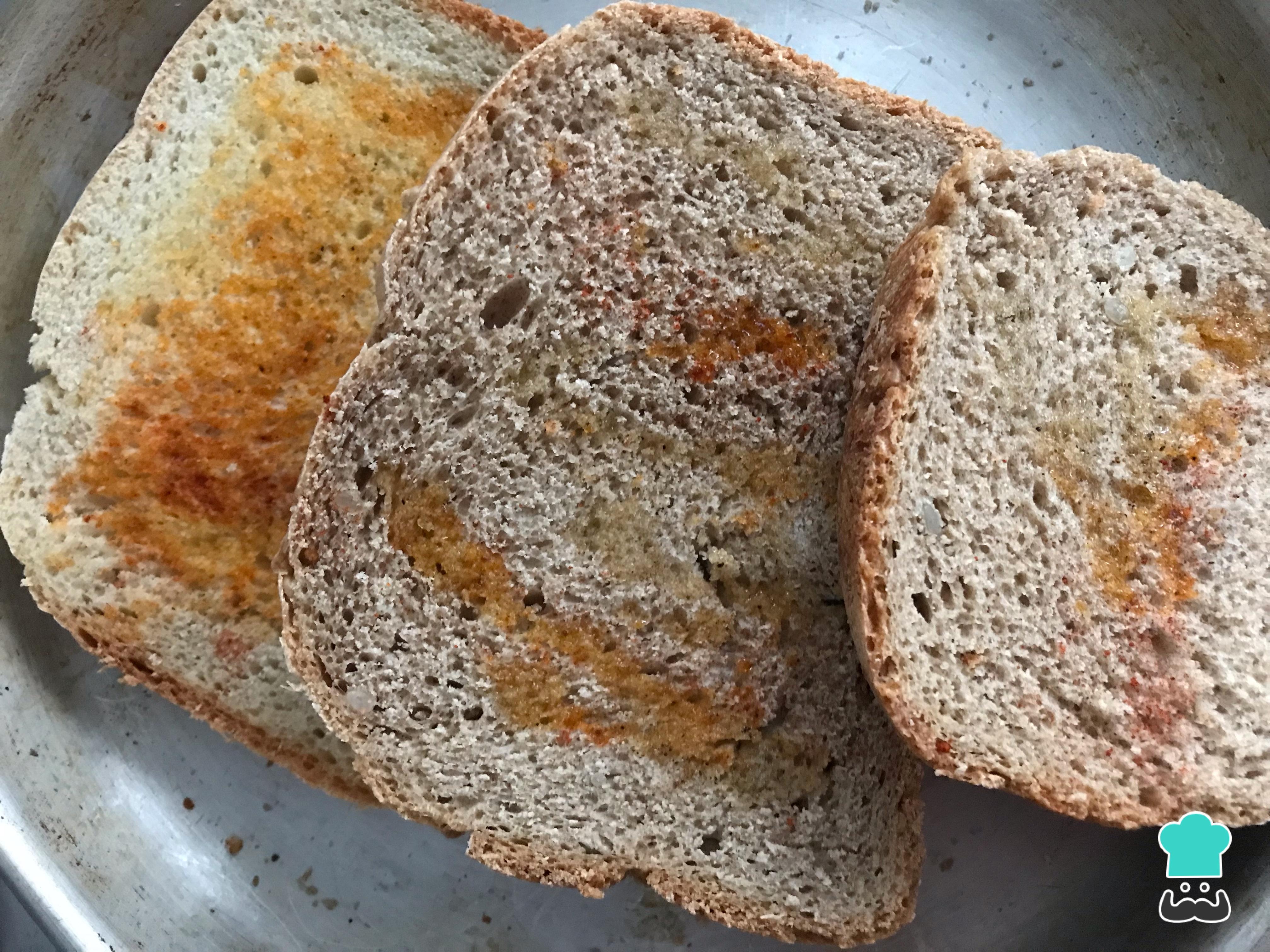 Mientras, unta los panes con el aceite de oliva y espolvorea por encima el pimentón. Tuéstalos al horno a 160 ºC durante 10 minutos o hasta que estén dorados, pero no quemados.