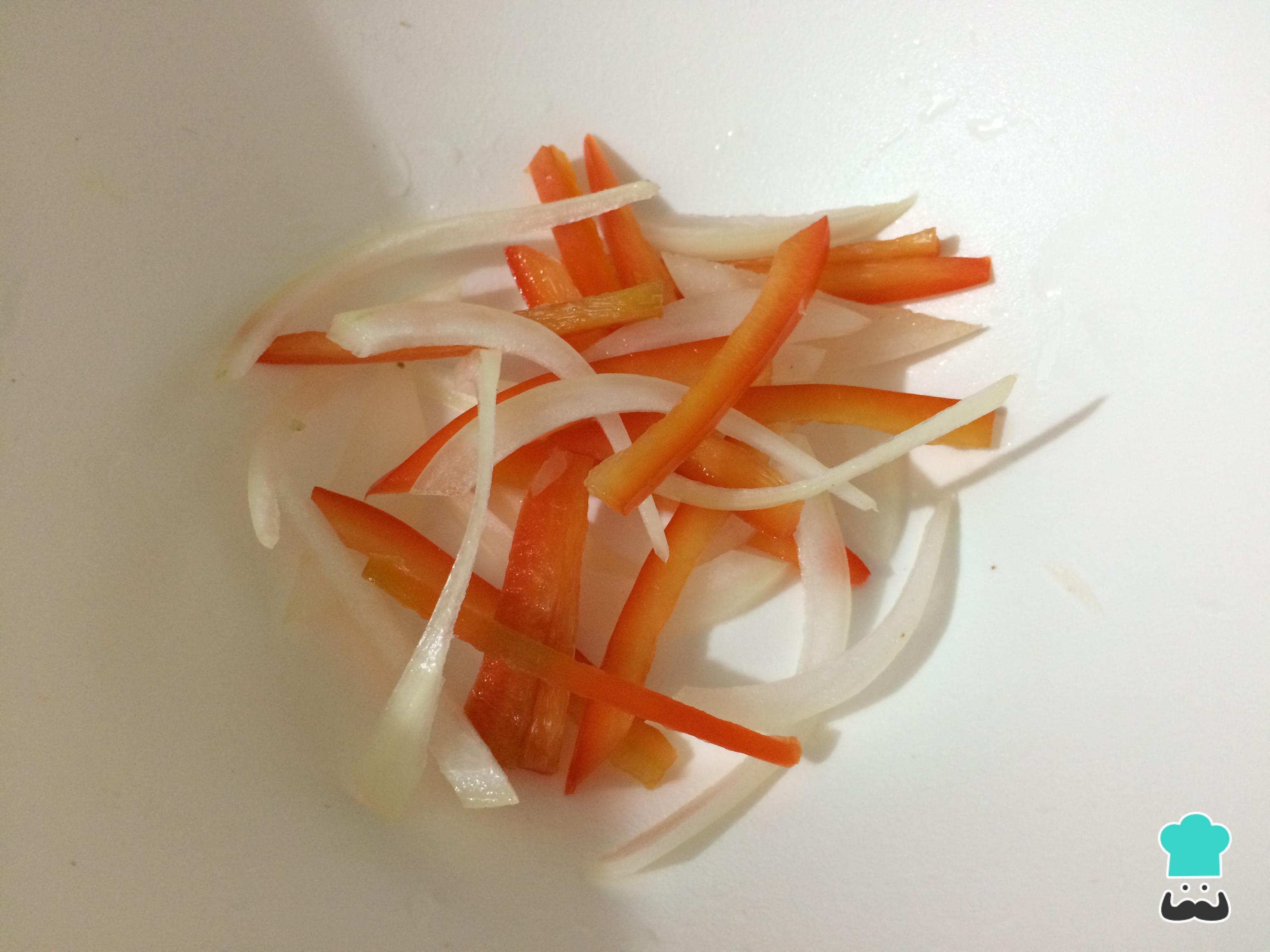 En un bol mezclar la cebolla blanca con el pimiento rojo cortado en tiras delgadas.