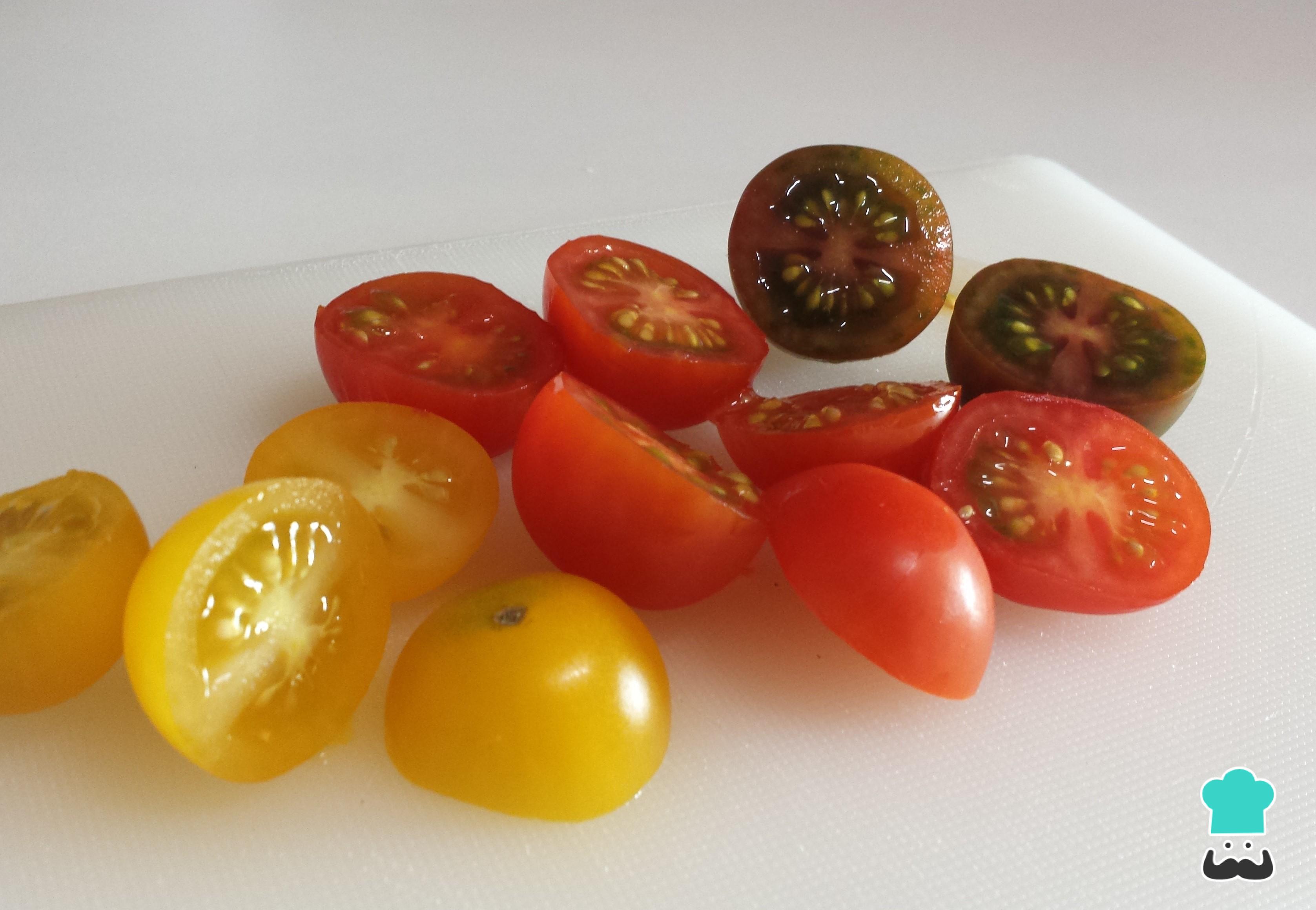 Empezamos entonces a listar los extras de nuestra ensalada de arroz . Corta los tomates por la mitad, recuerda que yo siempre uso tomates cherry porque me gusta más su sabor pero tú puedes usar cualquier otro tomate para ensaladas que te guste.