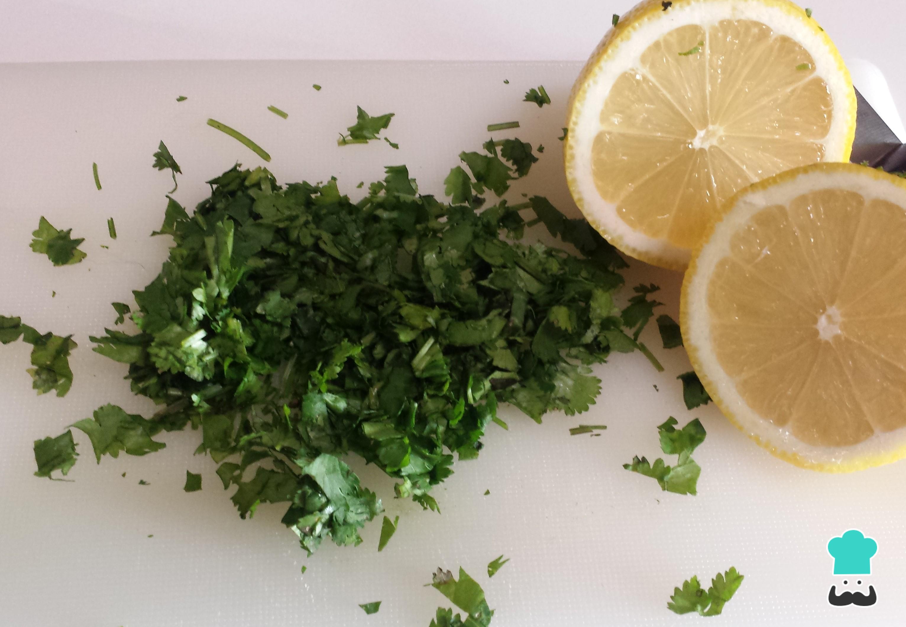 Para hacer el aderezo de nuestra ensalada de arroz basmati vamos a picar finamente el cilantro y mezclarlo con jugo de limón y una pizca de sal. Las cantidades en esta preparación también son al gusto, añade todo el jugo de limón que consideres necesario.