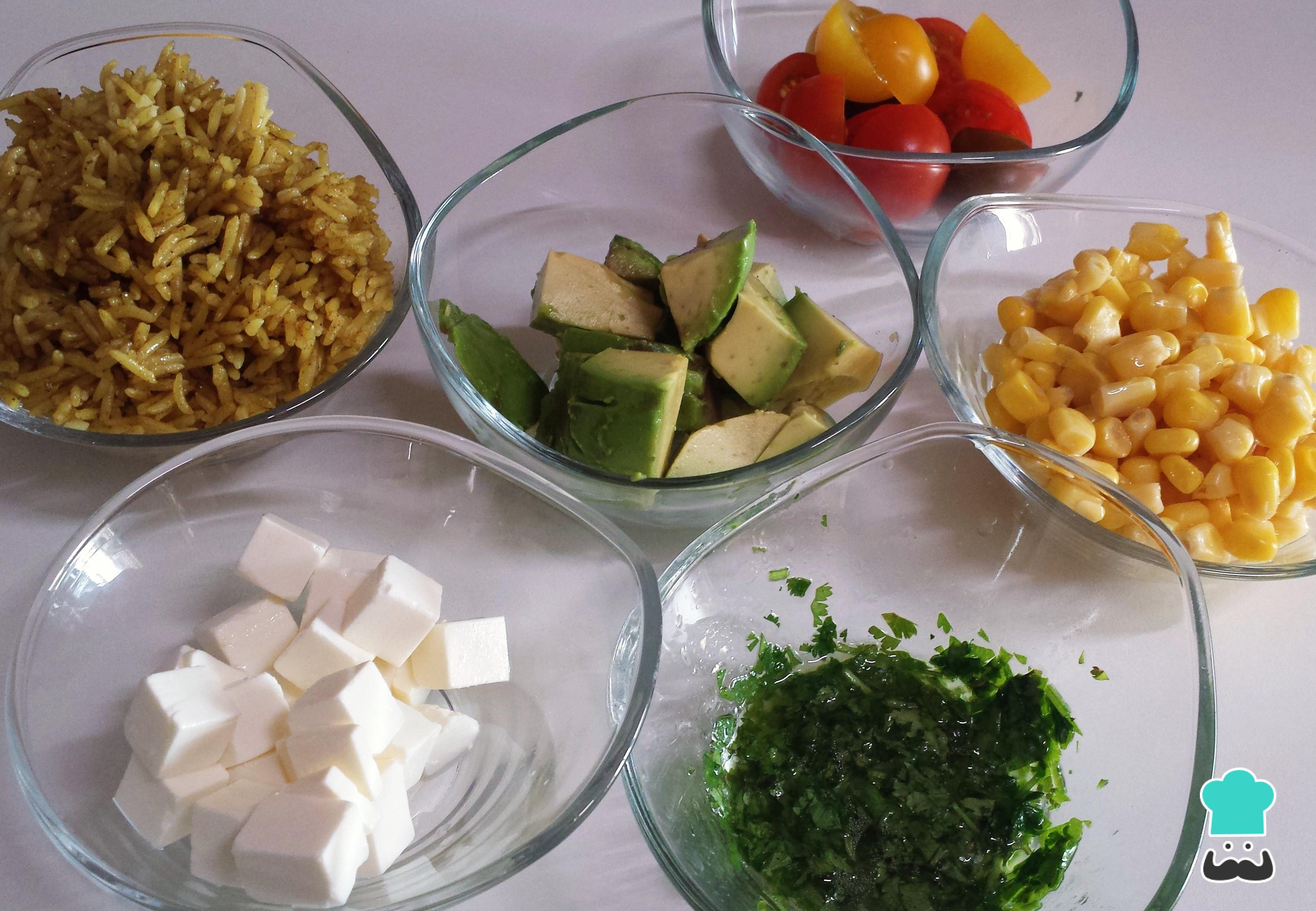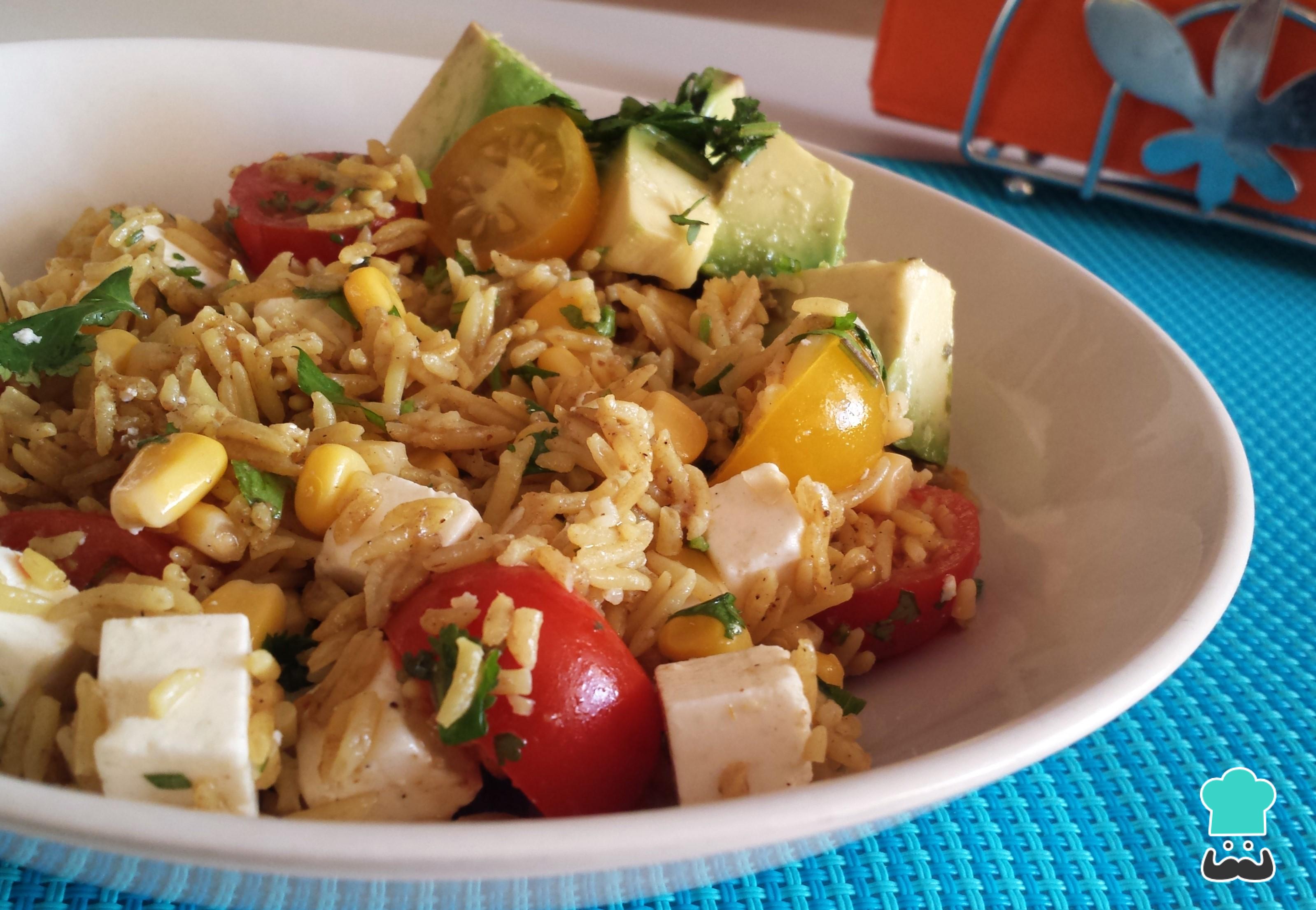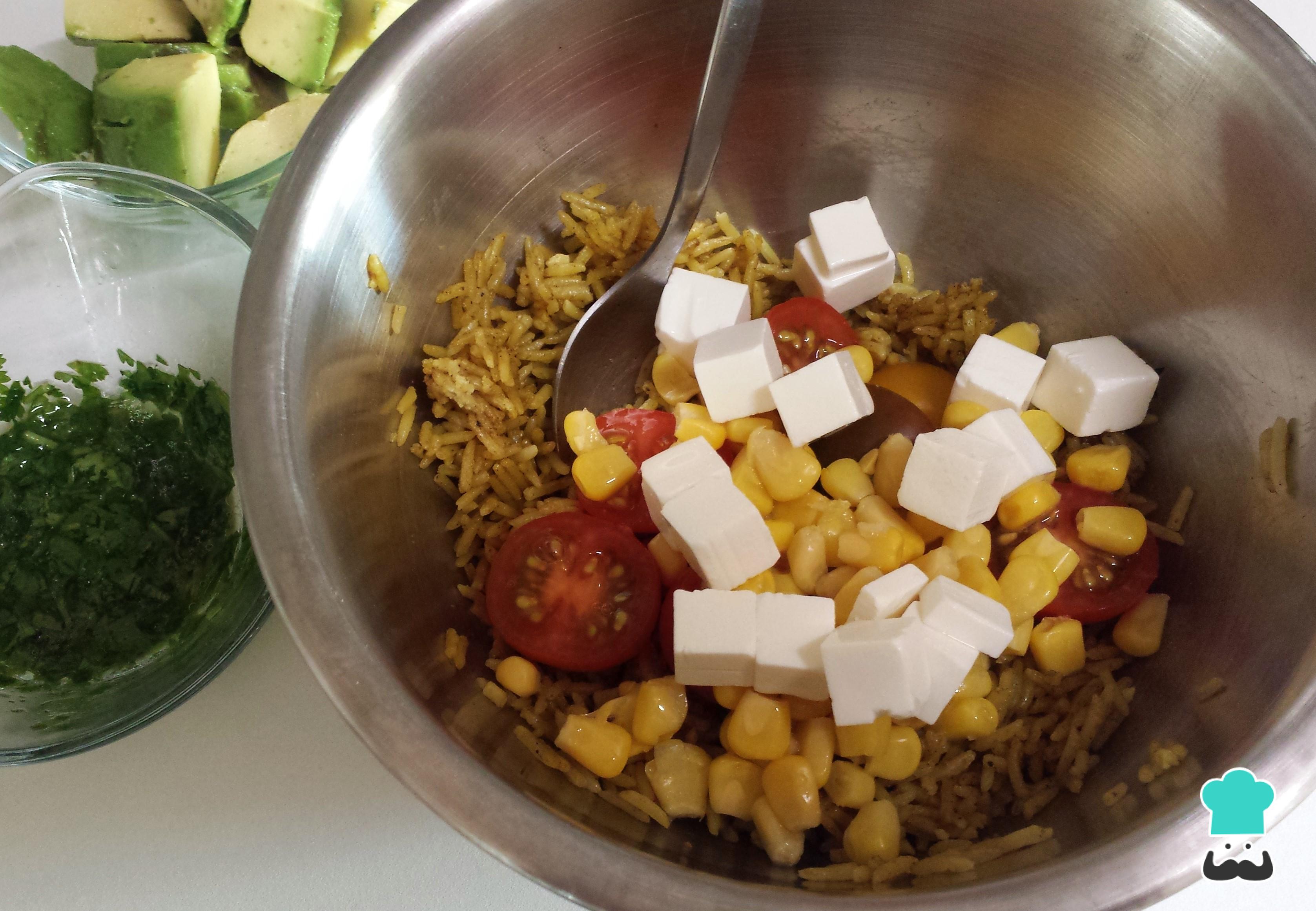 En este caso hemos usado un arroz con curry, fácil de conseguir para hacer en microondas y fácil de preparar paso a paso si tienes tiempo y ganas de cocinar. Aparte del arroz los ingredientes estrella de esta ensalada ligera son el aguacate y el queso fresco, todo esto combinando con un aderezo de cilantro y limón que realzará todos los sabores del plato y le dará un toque fresco inconfundible.