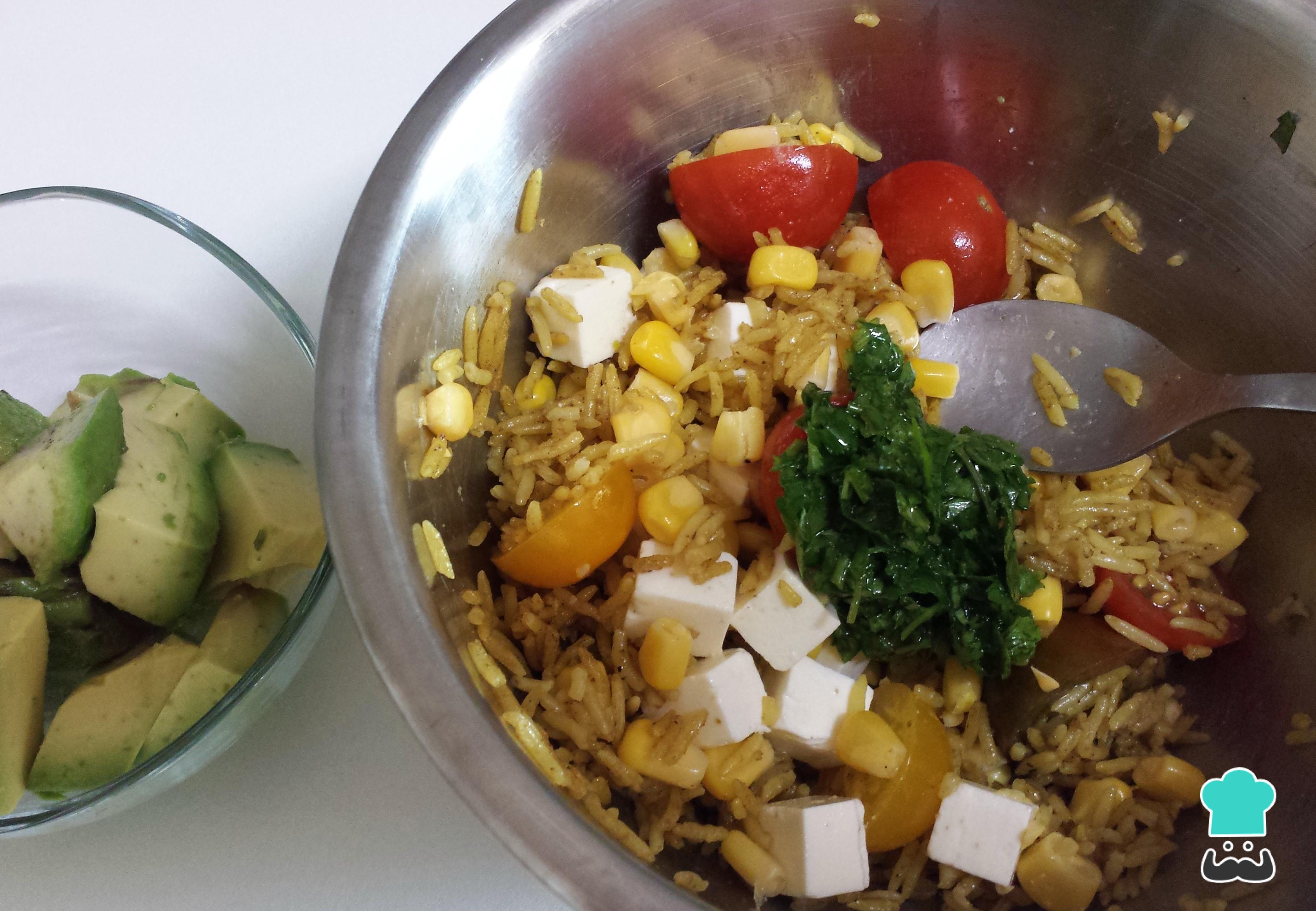 Empieza mezclando en un bol el arroz con el queso, el maíz y el tomate. Estos ingredientes son más consistentes así que nos permitirá revolverlos bien, sin problemas, para repartírlos de forma uniforme.