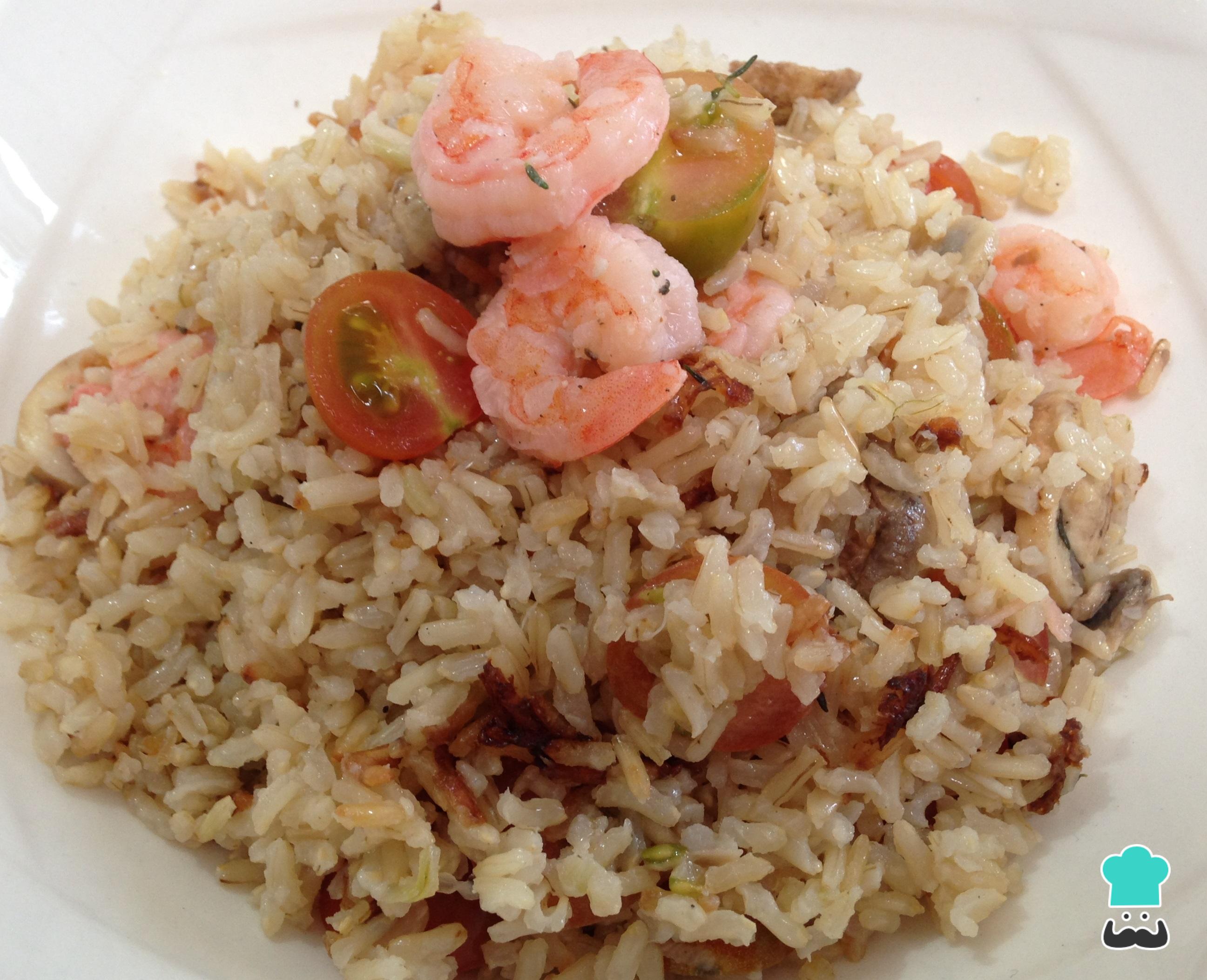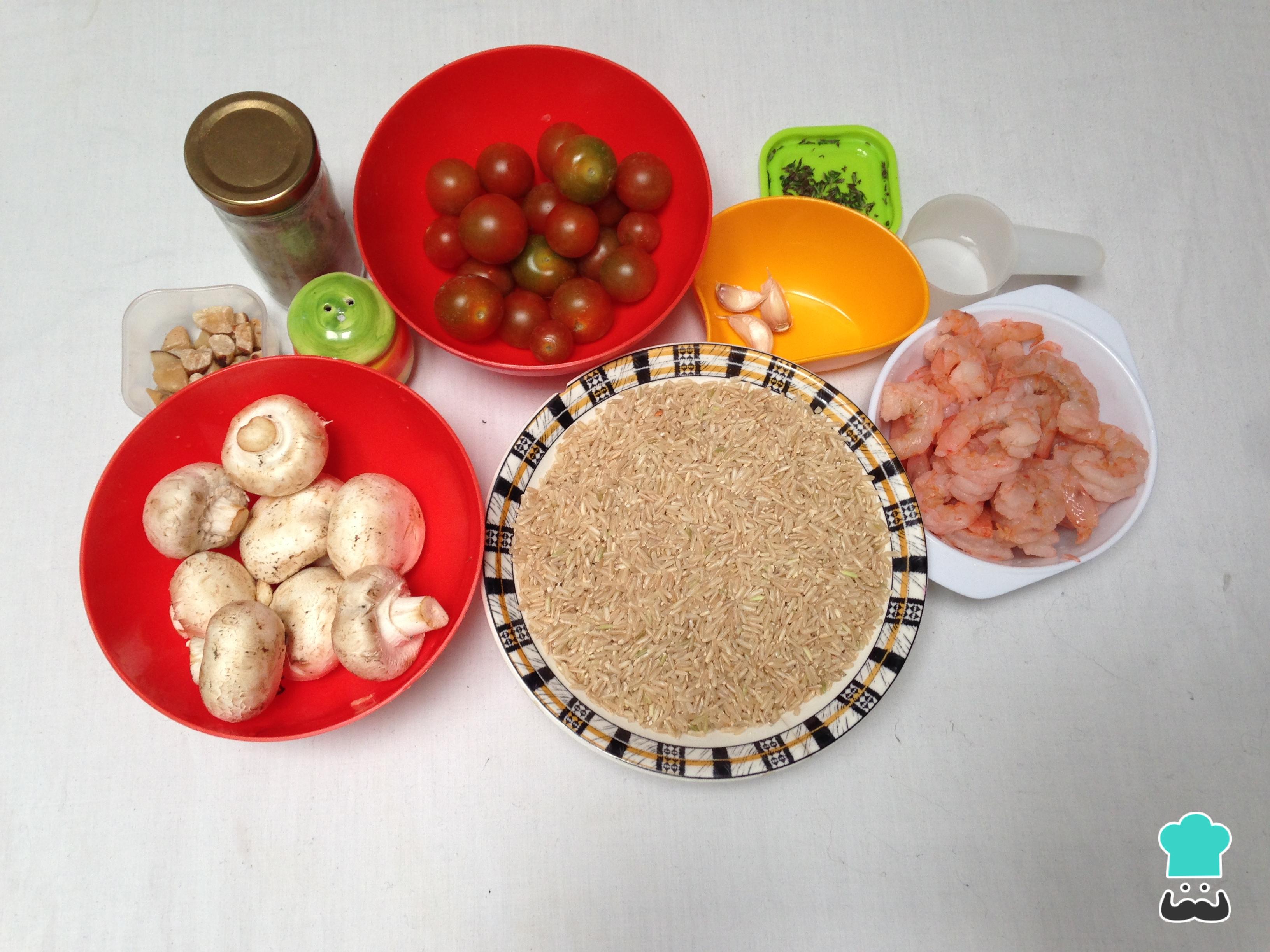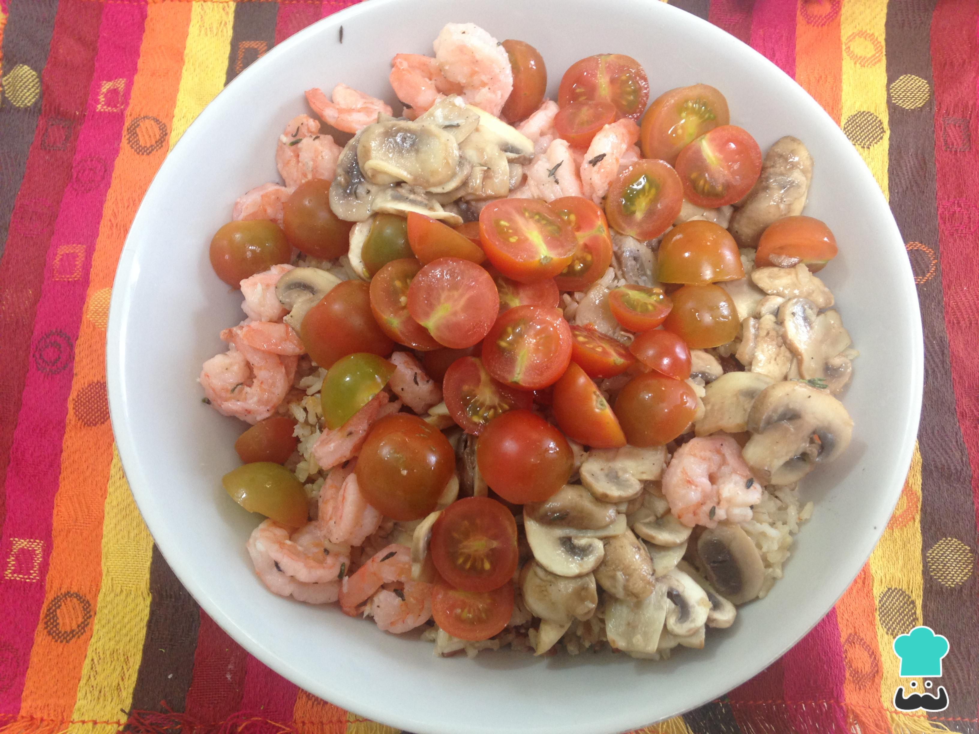 En un recipiente amplio comenzamos a unir todos los ingredientes de nuestra ensalada de arroz, colocando los champiñones, las gambas los tomates cherry cortados en mitades y el arroz, para aderezar agregamos un chorro de vinagre blanco y tomillo.
