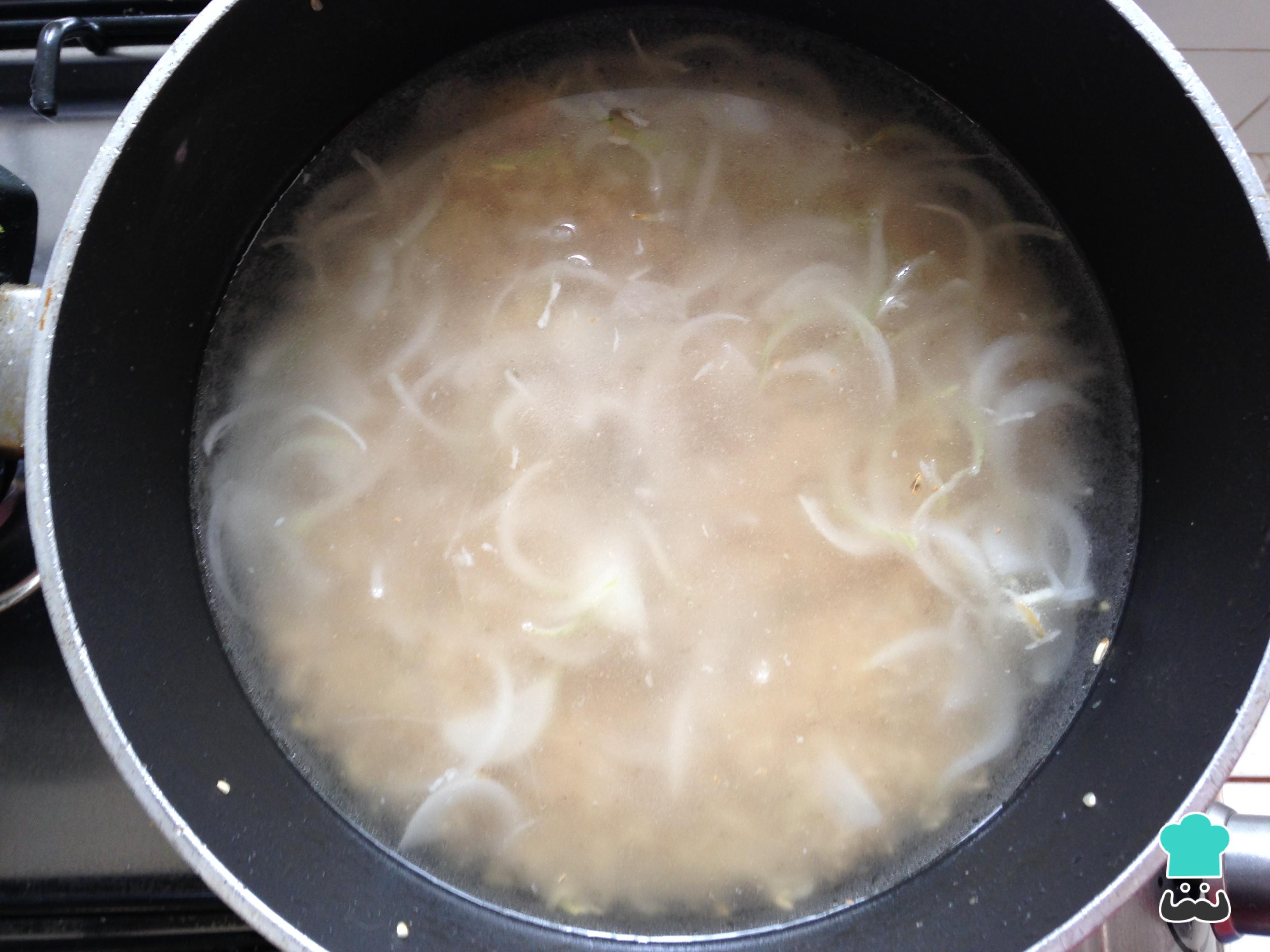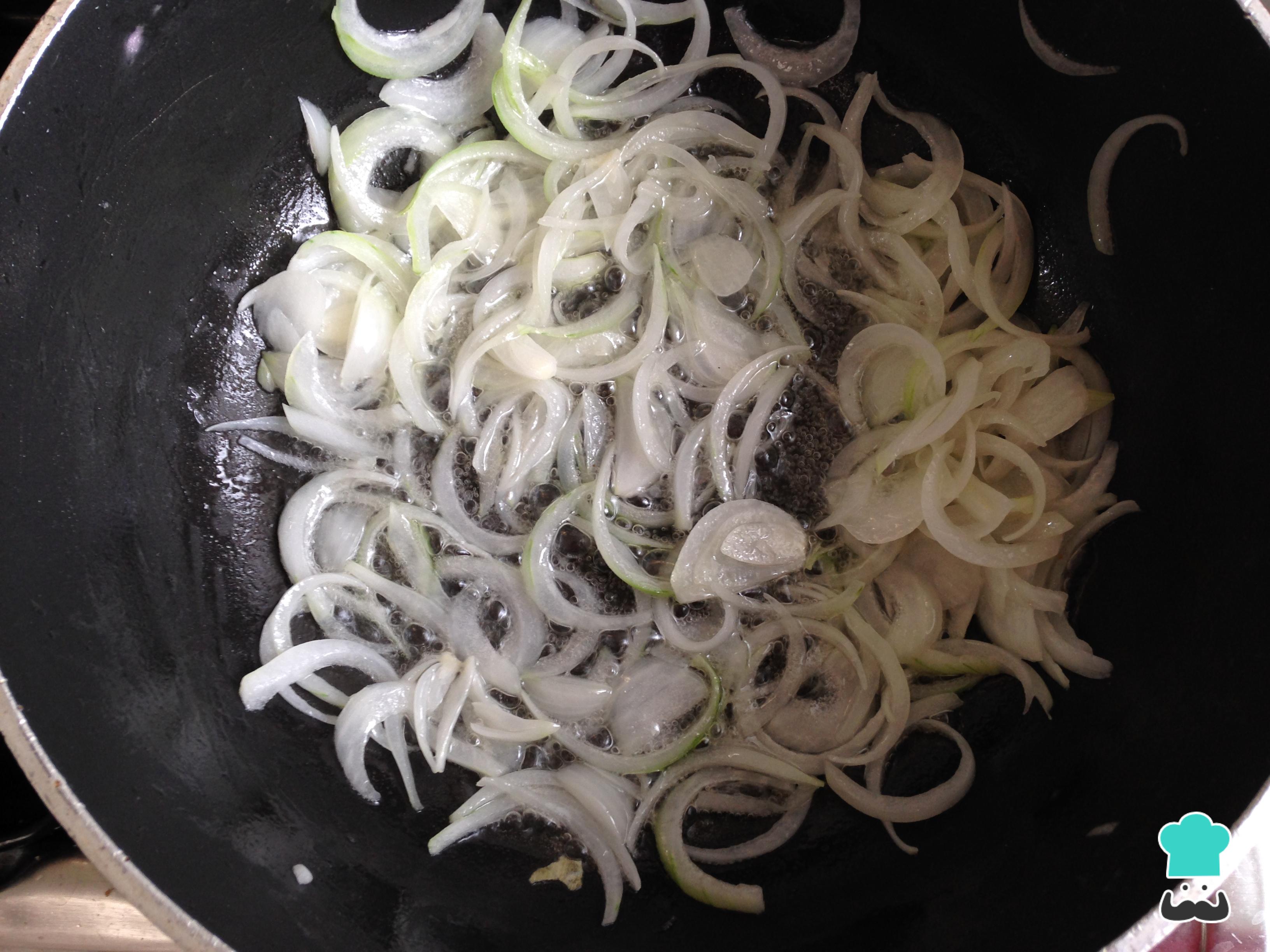Cortamos la cebolla en plumas y la salteamos en una olla bien caliente con un poco de aceite durante 4 minutos.