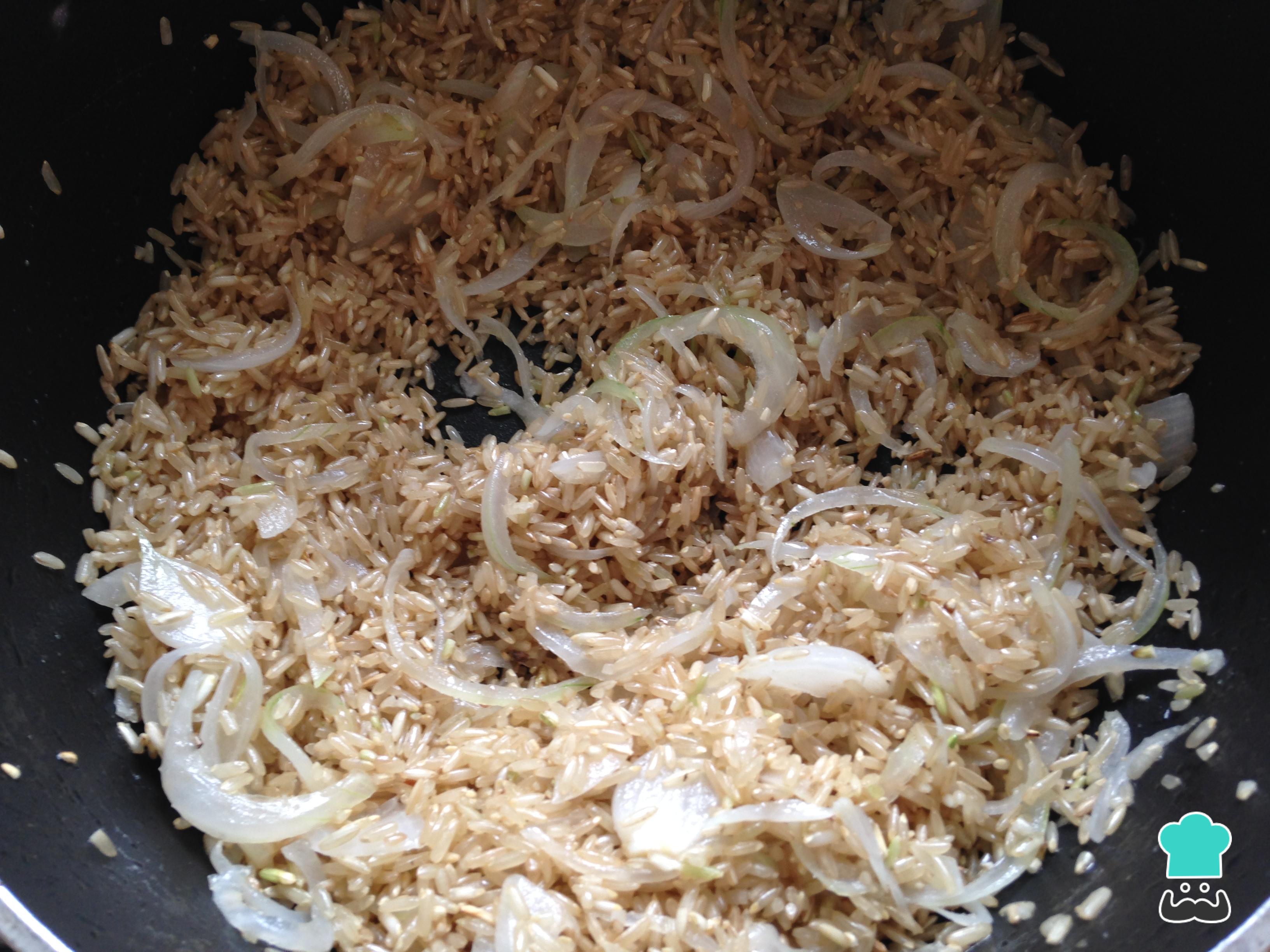 Pasados los tres minutos agregamos el arroz y cocinamos sin dejar de revolver durante 3 minutos mas.